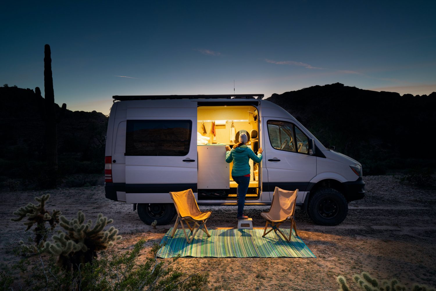 “Our Sprinter was designed and built as a four-season overlanding vehicle. It is capable of traveling to the remote destinations and cities of the world in a comfortable, self-contained manner. This vehicle uses only diesel and the sun for locomotion, cooking, hot water, and heat— no difficult to find propane gas fittings required for world travel. With the 30-gallon onboard water capacity and 50 gallons of diesel, long, remote tracks with no support services are possible.