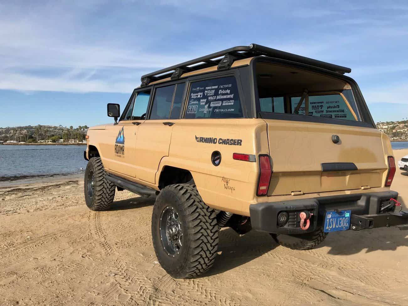 The entire Wagoneer has been covered in a durable tan wrap, and the trim has been painted to match for a seamless finish. The bumpers are custom fit Spartacus models from Rugged Ridge, and each sports a set of aftermarket LED lights, while the front bumper houses a Warn 12,000-pound winch with wireless controller, synthetic rope, and a Factor 55 Ultrahook. The headlights and driving lights have also been updated to JW LEDs for improved visibility, and they do a tremendous amount to change the overall look. On the roof, a low-profile Rhino-Rack Pioneer platform is ready to haul bikes, kayaks, and anything else you need on your next adventure, while a Rugged Ridge Spartacus light bar illuminates the path ahead. (What SEMA build doesn’t have an LED light bar?) Since this Wagoneer is a full-size Jeep and intended for off-road use, IAMROAMR added a set of Spartacus sliders to protect the vehicle’s rocker panels. Then there’s the suspension, and that’s where things get really interesting.