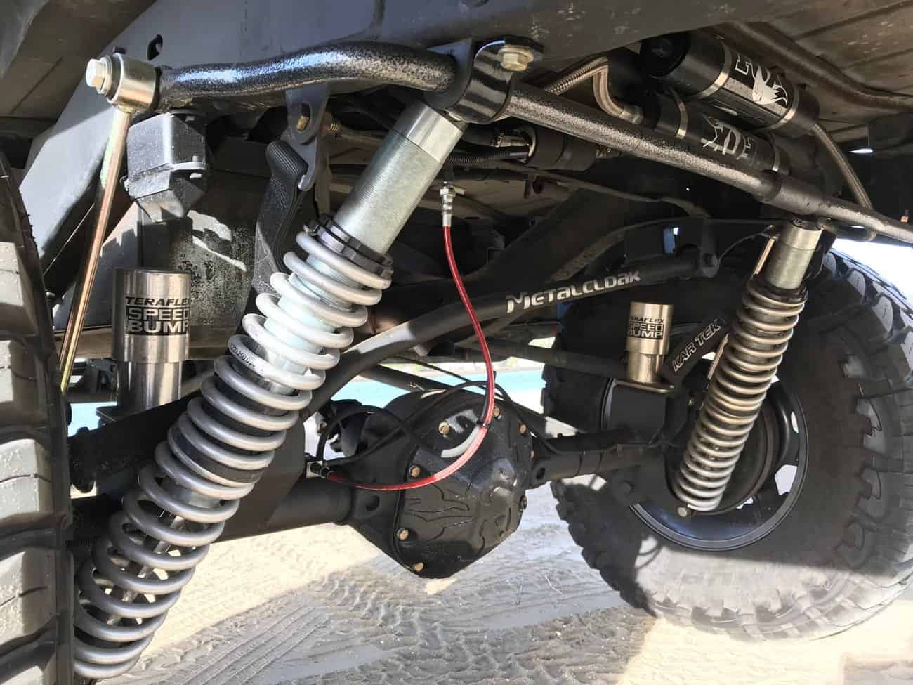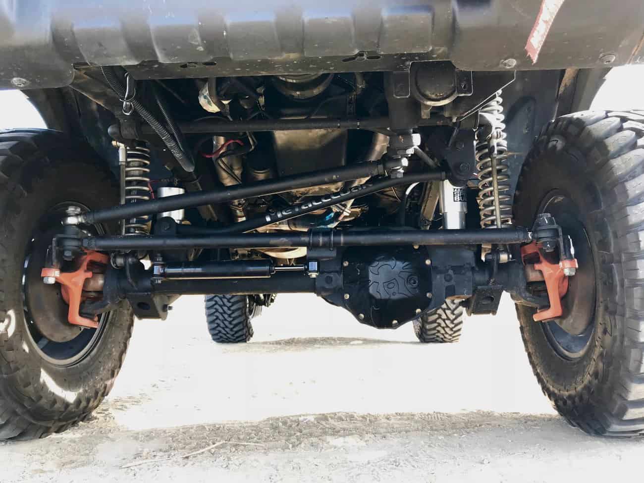 Although the Dana 44 axles are original, both the front and rear axles have been completely rebuilt with RCV chromoly axle shafts and brand new Warn Locking Hubs. Poison Spyder diff covers were added for additional protection on the trail, and it is running on 4.10 gears with Eaton Detroit Trutrac limited-slip differentials. As the finishing touches, IAMROAMR installed Tom Woods 1310 custom driveshafts with a new front axle truss.