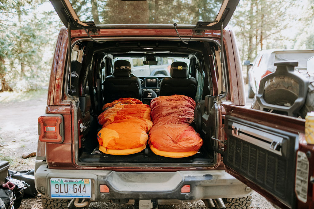 A dirt track led to our spot for the night, where we parked amongst towering pine trees. The 392’s rear seats folded down nicely, creating space for the sleeping pads and bags which made our bed. The rear seats do not fold flush, but we forgot our pillows, so a little bit of extra vertical wasn’t a huge deal. Space becomes limited when the rear seat and trunk are filled with two bodies, so we jammed and stacked the rest of our luggage on the front seats. Our 5-foot-8-inch and 5-foot-3-inch heights meant there was just enough space to wiggle our toes. A person of average size would find a ground tent much more comfortable.