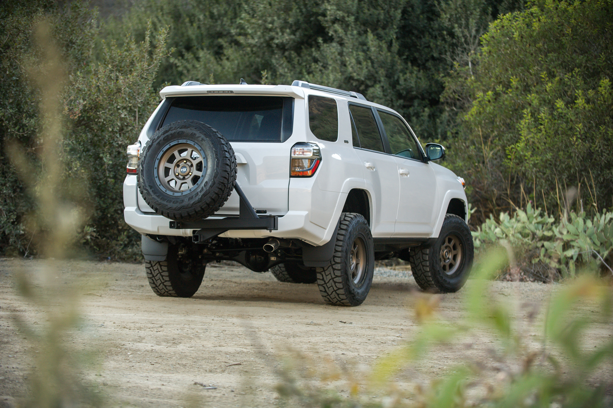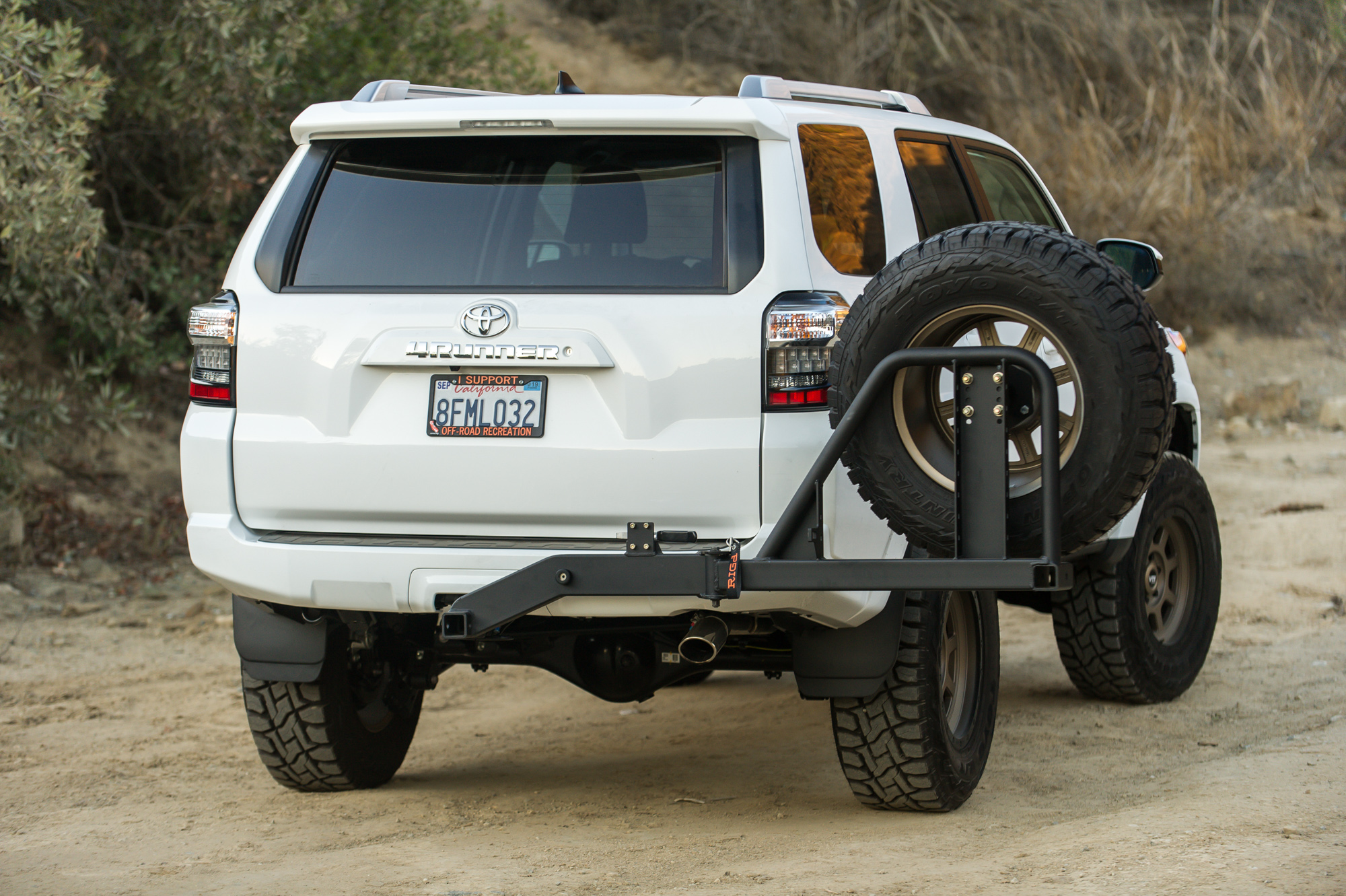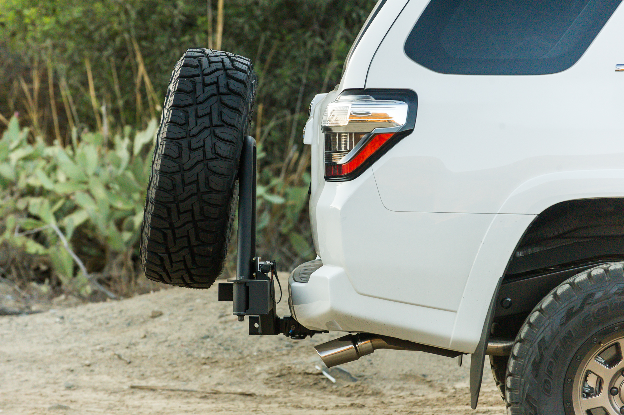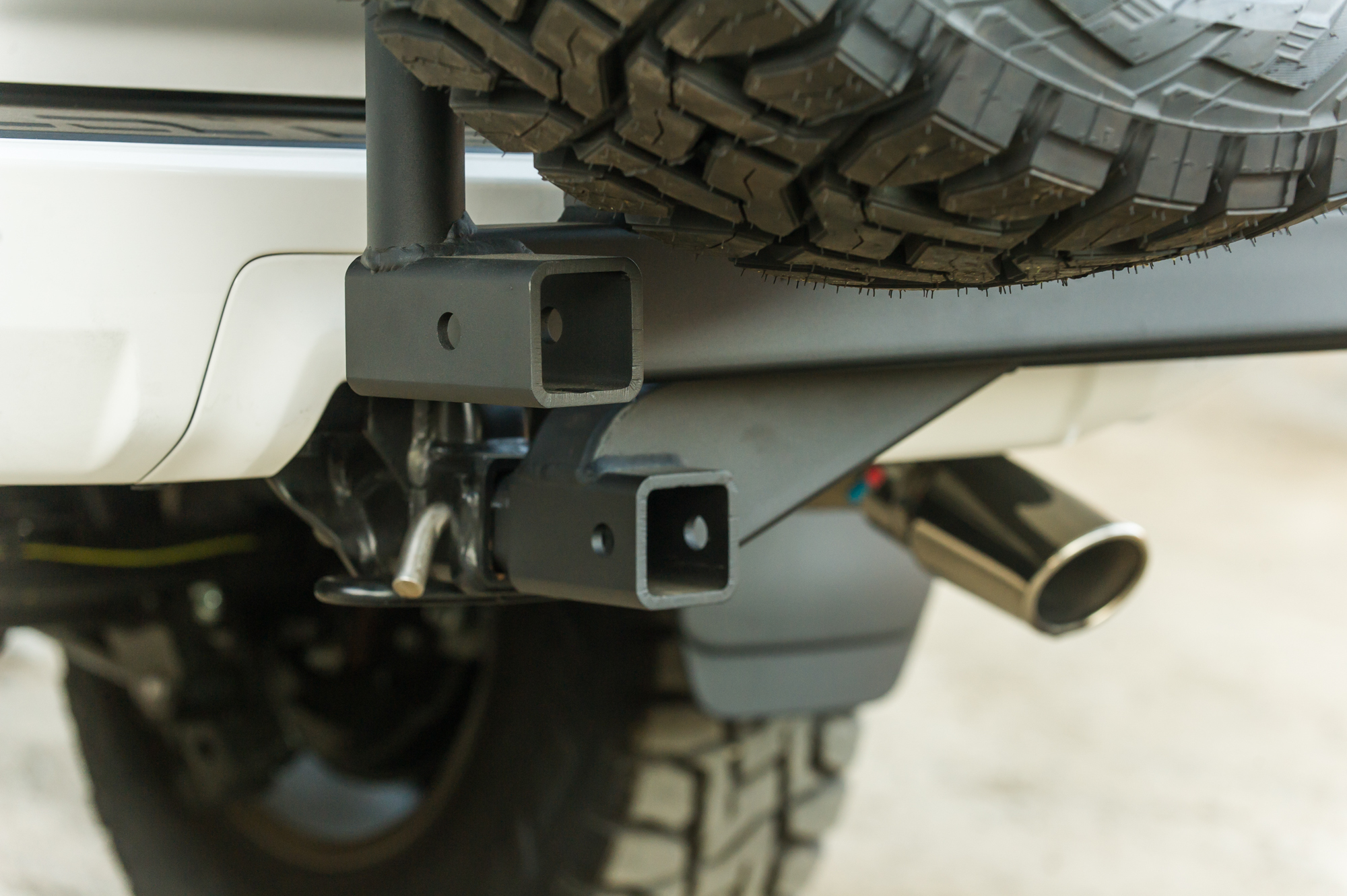 It’s capable of doing everything mentioned above, plus hold a jack, shovel, jerry cans, or other accessories while still functioning as your standard trailer hitch. Now, we haven’t seen how this will fair long-term with the torsion of off-road travel, so we asked about the weight ratings, testing, and previous experience of the designer. As it turns out, he has a background with Wilco, and knows a thing or two about this style of rack. It is rated to a total of 250 pounds, which is half of the receiver’s rating leaving plenty of margin for error there. To reduce stress on the rack itself and improve departure angle the tire was tucked in close to the tailgate, but it was also placed at an angle to reduce the leverage it could exert off road. When the hitch wedge is fully tightened, they claim to have no discernible movement, leading us to believe this package should hold up for some time.