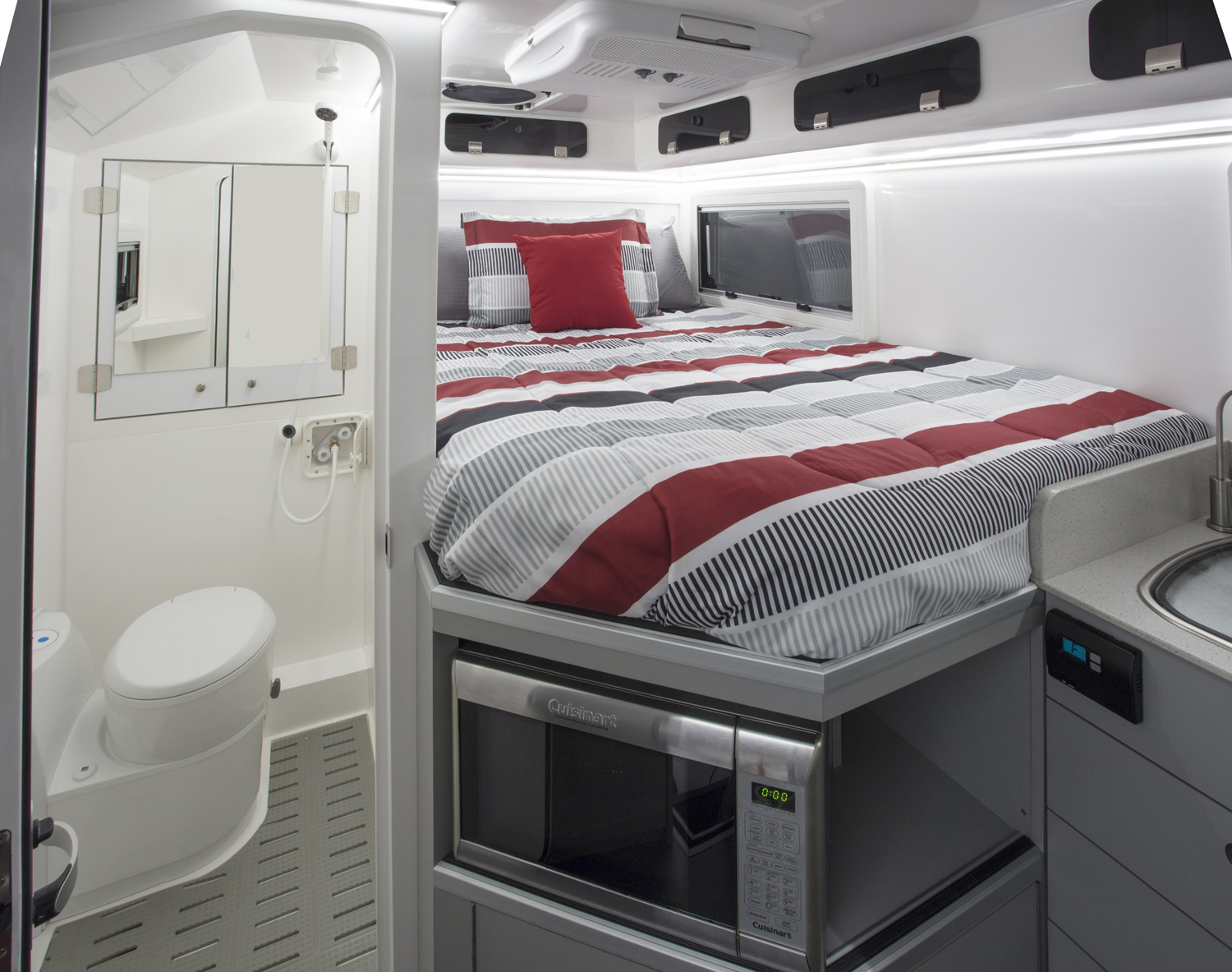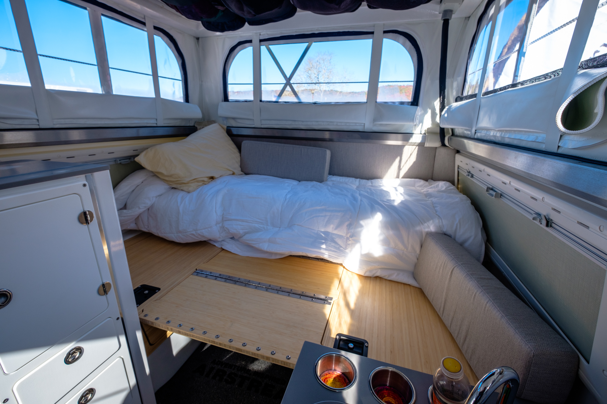 One of the hot trucks at Expo East this year was an all new platform from Earth Cruiser called the EXD. It utilizes a composite body which can be bolted to almost any chassis with an 8-foot bed and single rear wheels. The entire package is designed to be lighter and more nimble than their larger Fuso mounted EXPs, giving the platform a wider range of destinations and capability. But don’t let its size deceive you, Earth Cruiser didn’t sacrifice any comfort in exchange.