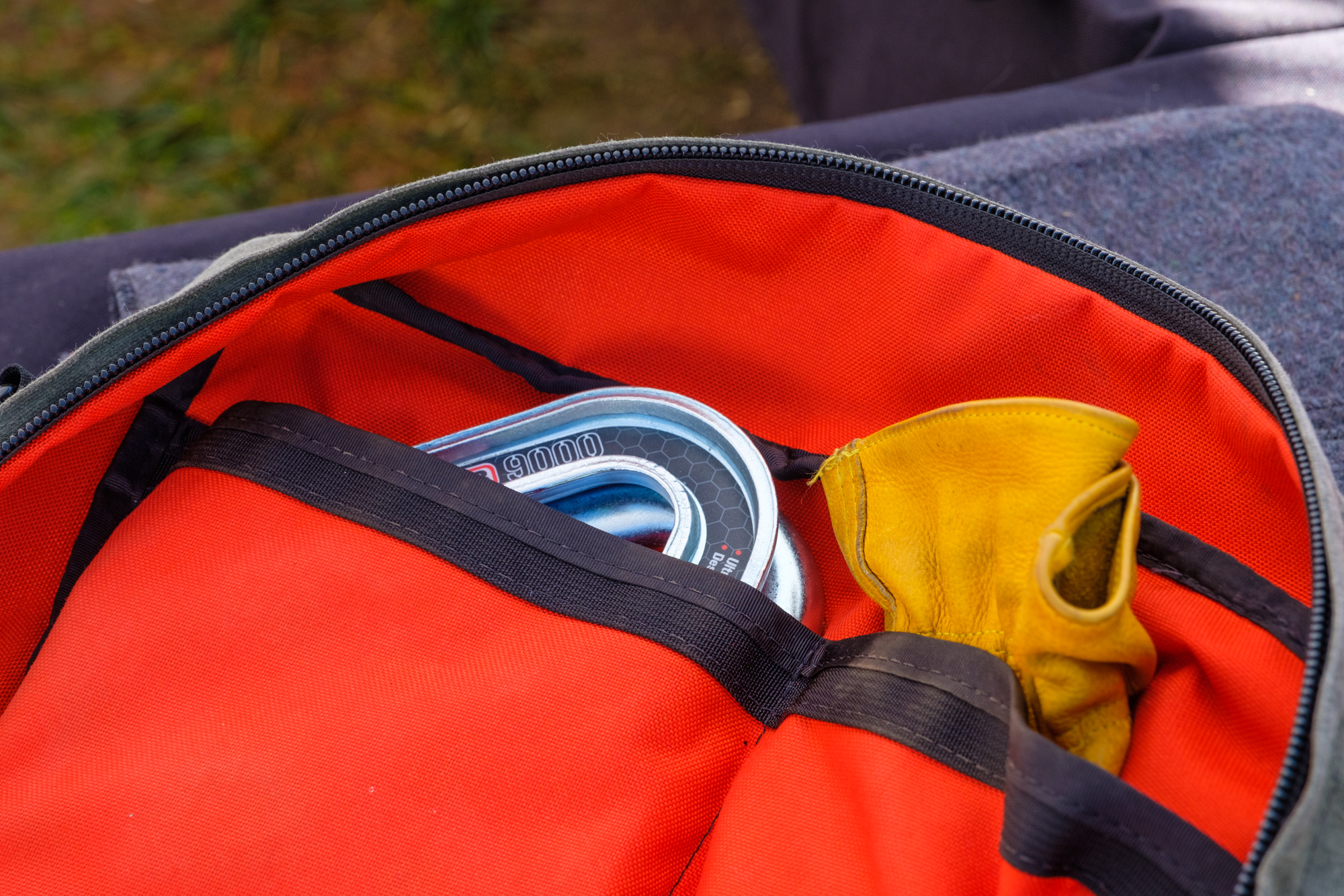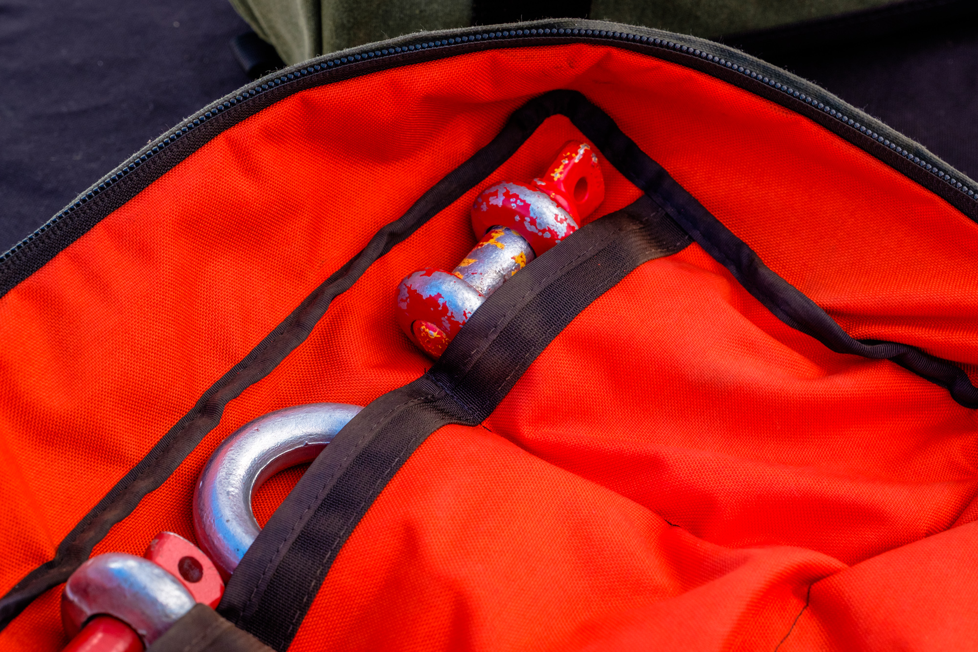 Inside you’ll find reinforced pockets ready to accomodate heavy shackles, ropes, and snatch blocks, with MILSPEC high-tensile nylon stitching and binding tape in the seams for additional protection against tears. These pockets will not only keep your gear organized and protected, but also isolated without the annoying rattles of metal clanking together.