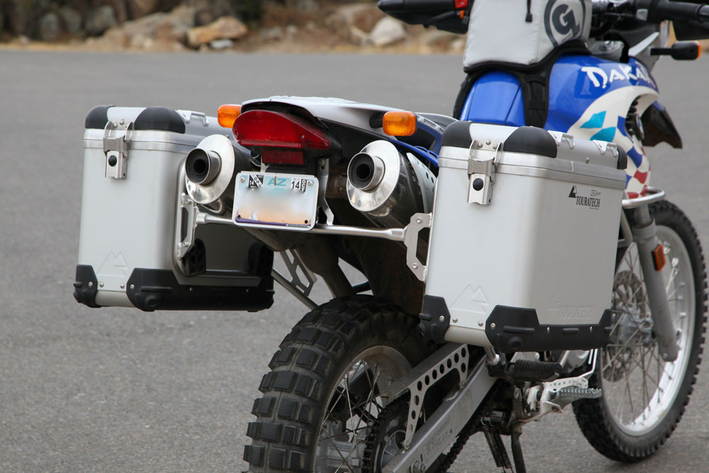 The last major addition to the Dakar was a set of Touratech Zega Pro anodized panniers. Not only are they a handsome addition, they’re incredibly well built and easy to use. Because the F650GS is a relatively small and nimble adventure bike, we opted to go with the smallest size panniers. At 31 liters, they’re slim and light, yet big enough for protracted adventure travel. Easy to remove without a need for tools, they’re a nice addition to a bike which will see a constant mix of true adventure riding paired to daily commuting duty.