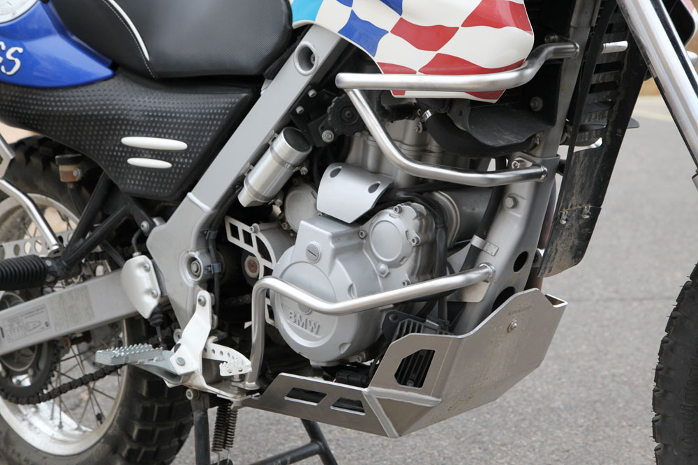 Any adventure bike worth its salt needs protection, so a full compliment of skid plates, engine, and tank guards were fitted. The factory skid plate didn’t seem hideous until we replaced it with the Touratech skid plate. Not only does it look better, it’s clearly a more substantial guard. The crash bars are elegantly simple, and don’t hang off the bike like a busted birdcage. All of the vitals now seem appropriately shielded from mishap. Additional praise for the crash bars can be attributed to the fact they don’t impede access to  essential components for regular maintenance. The “gas tank” panels can even be removed without pulling the upper crash bars off.