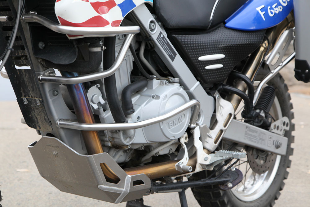 Any adventure bike worth its salt needs protection, so a full compliment of skid plates, engine, and tank guards were fitted. The factory skid plate didn’t seem hideous until we replaced it with the Touratech skid plate. Not only does it look better, it’s clearly a more substantial guard. The crash bars are elegantly simple, and don’t hang off the bike like a busted birdcage. All of the vitals now seem appropriately shielded from mishap. Additional praise for the crash bars can be attributed to the fact they don’t impede access to  essential components for regular maintenance. The “gas tank” panels can even be removed without pulling the upper crash bars off.