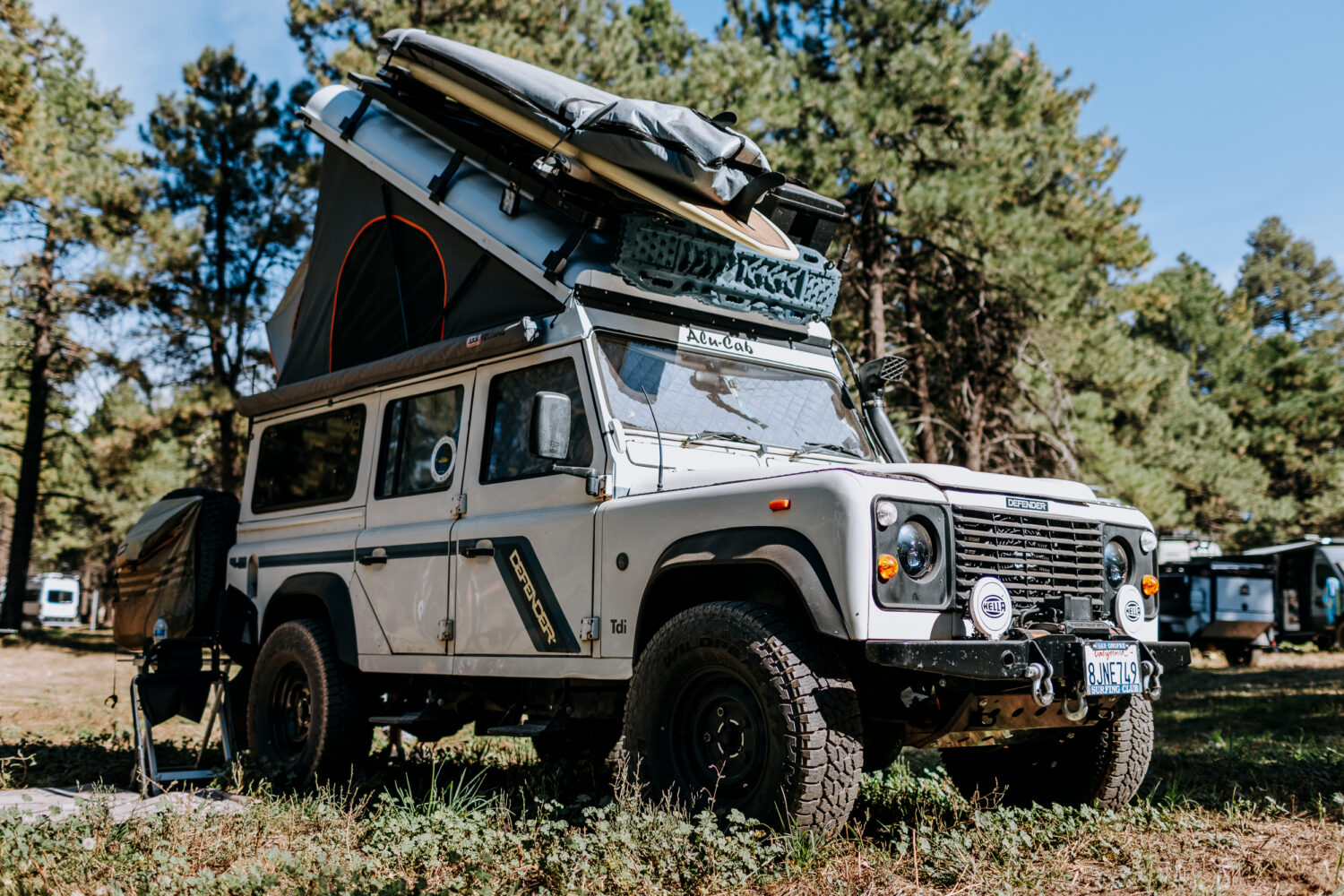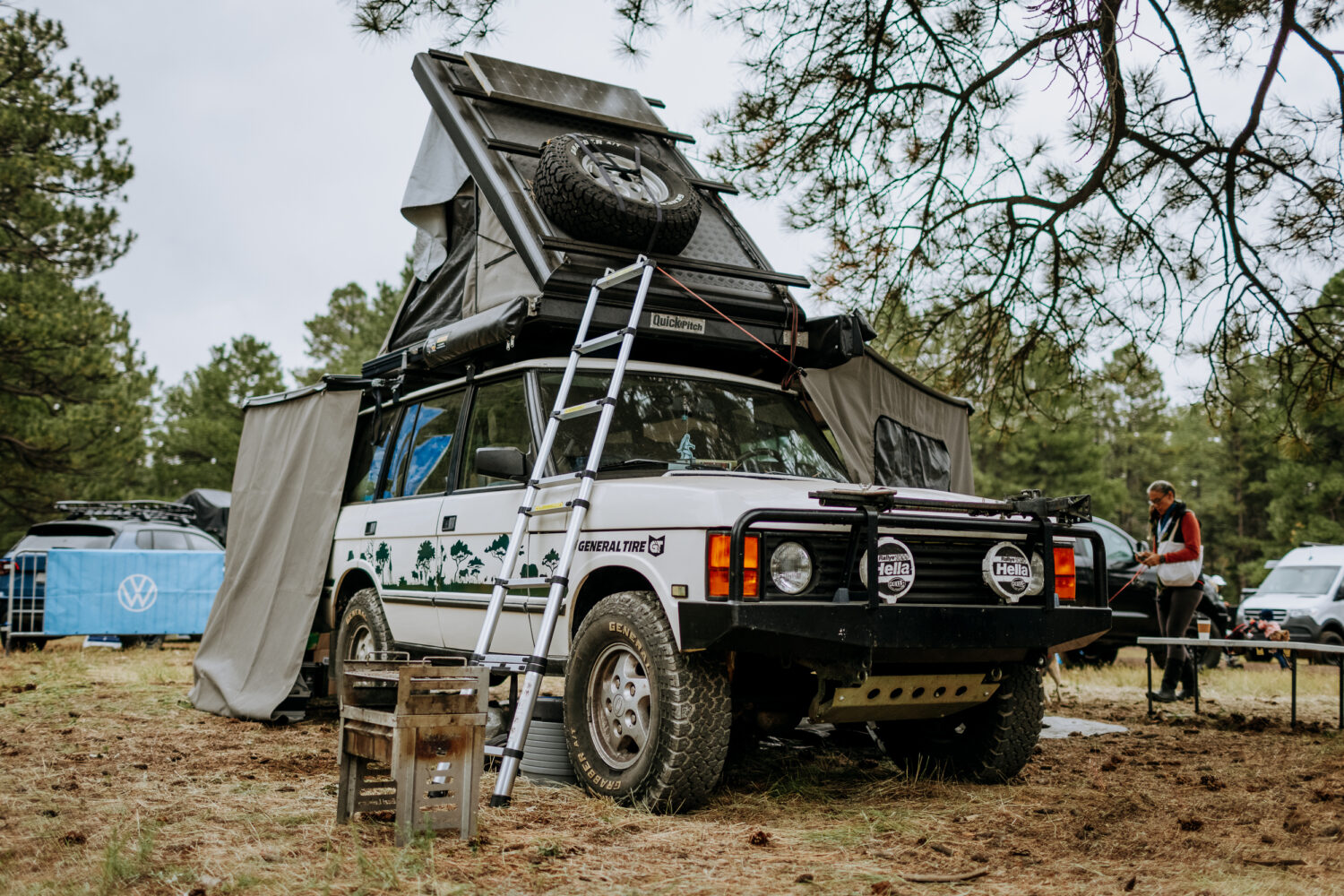 Well past the booths, the food trucks, and the crowds lies a vast onsite camping area filled with pine trees and Expo enthusiasts from all walks of life. After a long trek from the vendor area, I spotted Bob and Kathy Kelly’s 1993 turbo-diesel Land Rover Defender, outfitted with an Alu-Cab top, extruded aluminum storage (built by Bob), and a diesel heater.