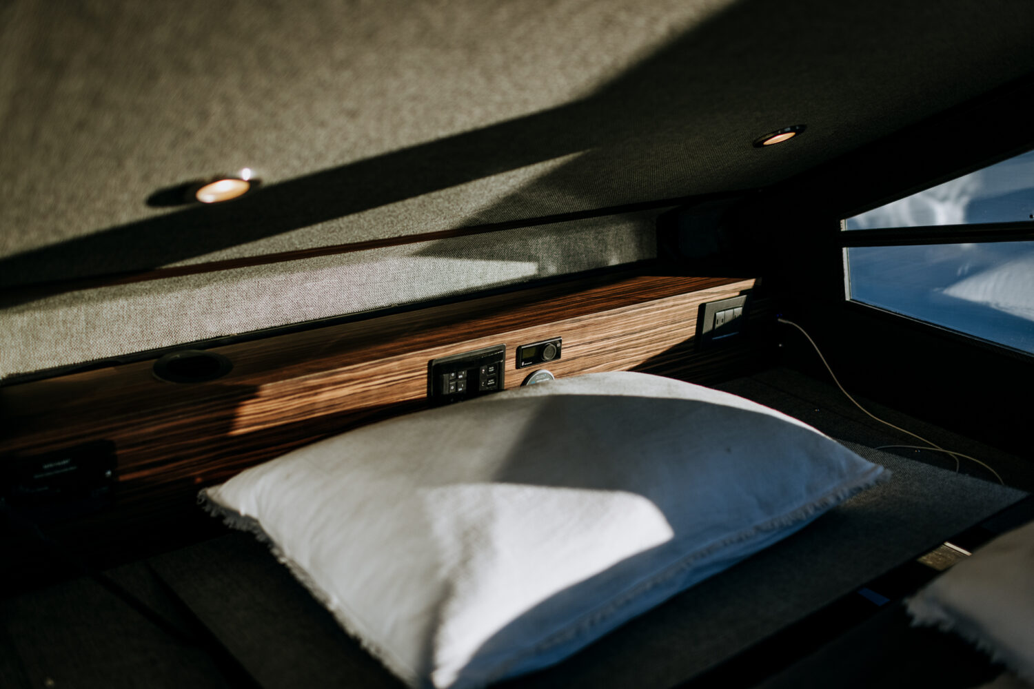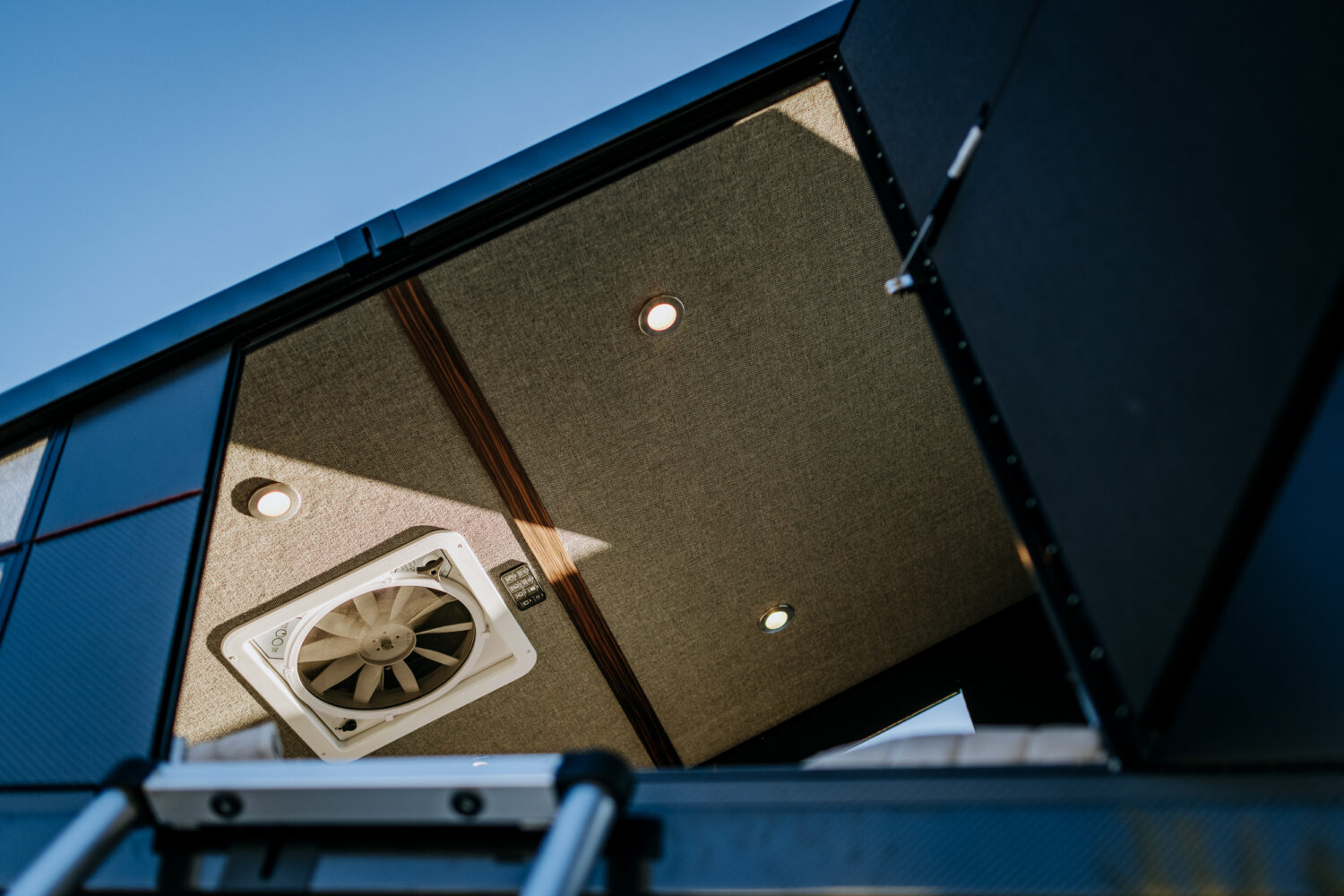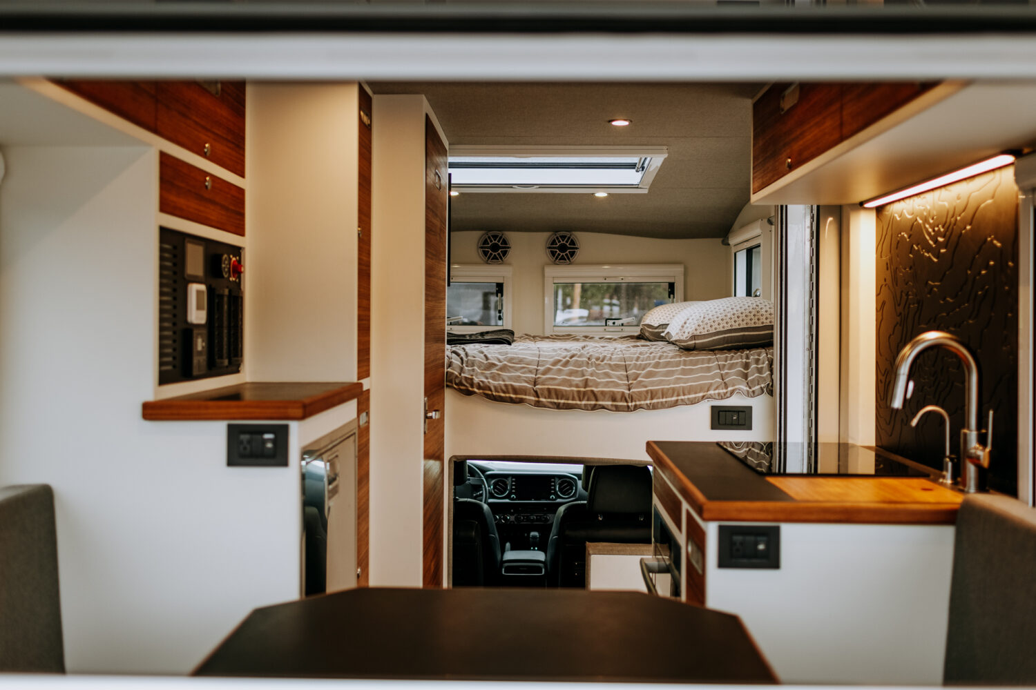 The result is a high-end fully insulated carbon fiber tent that is available in various trim packages, including integrated solar, batteries, an inverter, heating system, USB outlets, a fan, a queen-sized mattress, dimmable interior and exterior lighting, and an optional pass-through into the vehicle’s cab. The dual-pane polycarbonate window in the rear is huge, at 5 feet high by 42 inches wide. “We wanted to accentuate the look of the vehicle and do something a little more fuel-efficient, sleek, and modern. Plus, the carbon fiber shell keeps it below 300 pounds.”