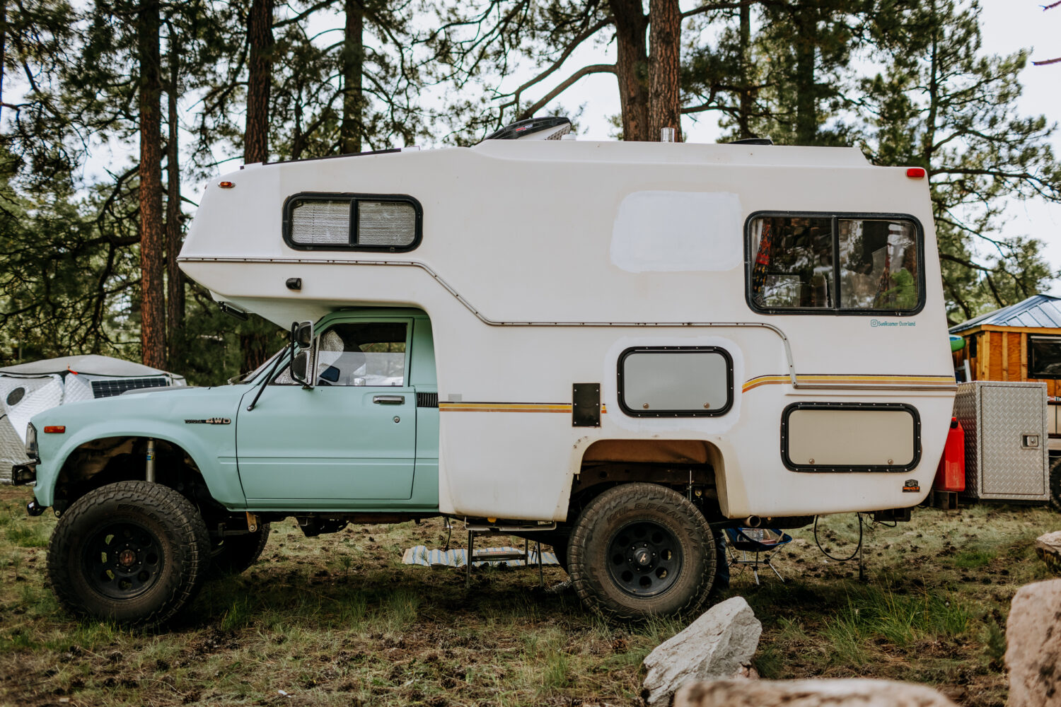 Owner Bradley Enlow admits that his favorite part of his 1982 Sunrader build are the smiles he receives wherever he goes, the appreciation for the work involved, and conversations that are started with strangers. “I love passing on what I have learned. Like any project built on a budget, you need to learn new skills. The main ones for me were fiberglass and building a DIY lithium battery solar system.” Other highlights of the build include an Exped Megamat Duo mattress, a Grizzly Cubic mini wood stove, Sumo progressive bump stops, and a Marlin Crawler adapter to a gear-driven transfer case.