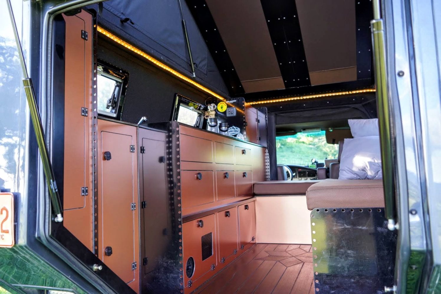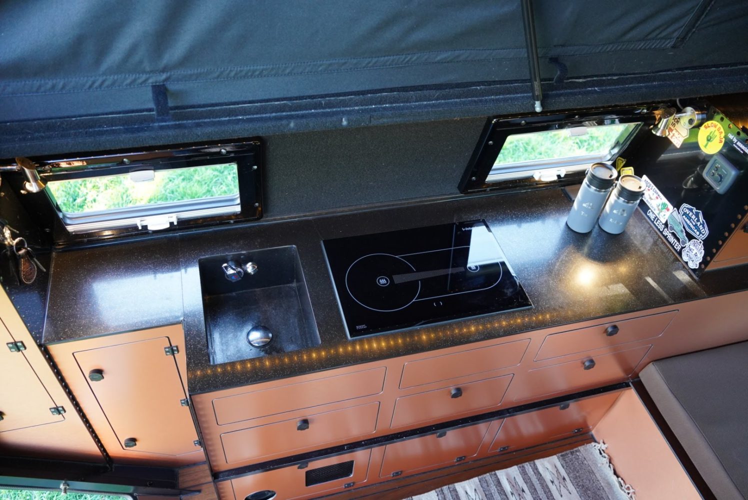 Finally, after all the prep and maintenance work was complete, the Hubers took “Dusty” (named after Dusty Bottoms from The Three Amigos) through a shakedown run to Alaska to work out any last kinks before shipping overseas to Europe. Currently, in Turkey, the couple says they’ve enjoyed the indoor living space, the ability to sleep in the box with the pop-top down, and having a comfortable area to do computer work. “For me, it’s more of a home,” Kelsey says. “It’s a place that you can retreat into, especially when I’m making videos. It’s nice to have a controlled space and still have the ability to live outside.” They’ve often slept in the “downstairs” part of the camper due to rough weather in Alaska and the UK or to feel more stealthy or self-contained. Kelsey explains, “Sometimes you don’t want to impose if there are a lot of vans, and it’s kind of weird to put your tent up, so it was cool to have the option.”
