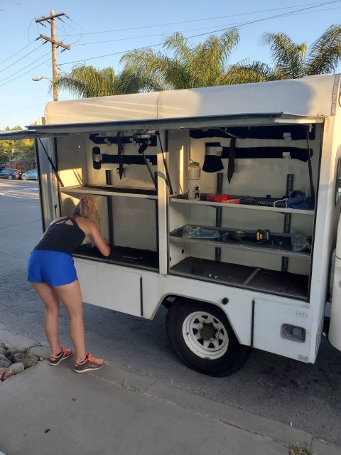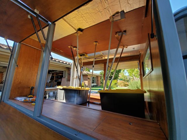 With the vehicle looking good and running well, attention turned to the rear box where all the magic happens, and the open space concept comes to vivid life. First, the young but calloused hands had to remove all traces of property owned by the Australian Government and Her Majesty the Queen. They dragged out over 400 pounds of metal (heavy-duty shelves, cladding, walls, etc.) and replaced gas struts for the four walls/doors, which had been redesigned and refabricated. Each wall/door now boasted new paddle latches, 1-inch ISO insulation boards between framing, weather-resistant gaskets, new wiring, and wood walls and vinyl wrap of the outer doors matched all woodwork.