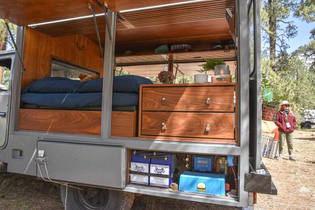 This “open concept” sets this vehicle apart from others and makes it quite unique. Yes, a swarm of bugs and a strong wind could ruin your day, but the vehicle does not have to have the open plan deployed to be a liveable space. On stormy, gloomy, cold, and nasty days, the vehicle seals into its original box dimensions. But when the weather is glorious, and the bears are fed, the couple can live indoors or outdoors with a cool breeze and a panoramic view of nature.