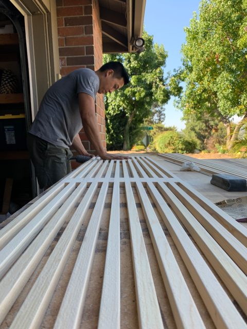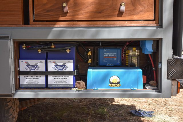 Sunflare Xplor solar panels (2 x 180W) teamed up with two 100 a/h Battleborn lithium batteries, a Victron controller and components monitor, and a 1200-watt inverter. A Shurflo water pump and accumulator work with a 21-gallon water tank and are routed through the custom under-bed drawers to the kitchen sink. Under the dimmer-equipped LED lights, Michael and Lauren installed custom slatted wood shelving, a wood pass-through dresser, and vinyl flooring. A Dometic 75 fridge kept the cold drinks coming and may or may not have been the center of the wrap party before the loving and long-suffering family eventually booted the youngsters and their new old girl out of the neighborhood.