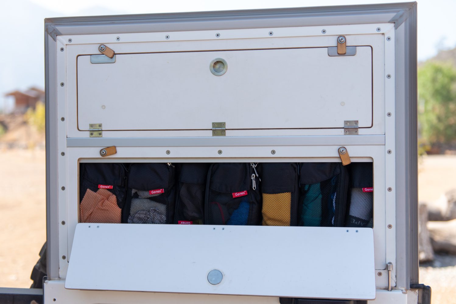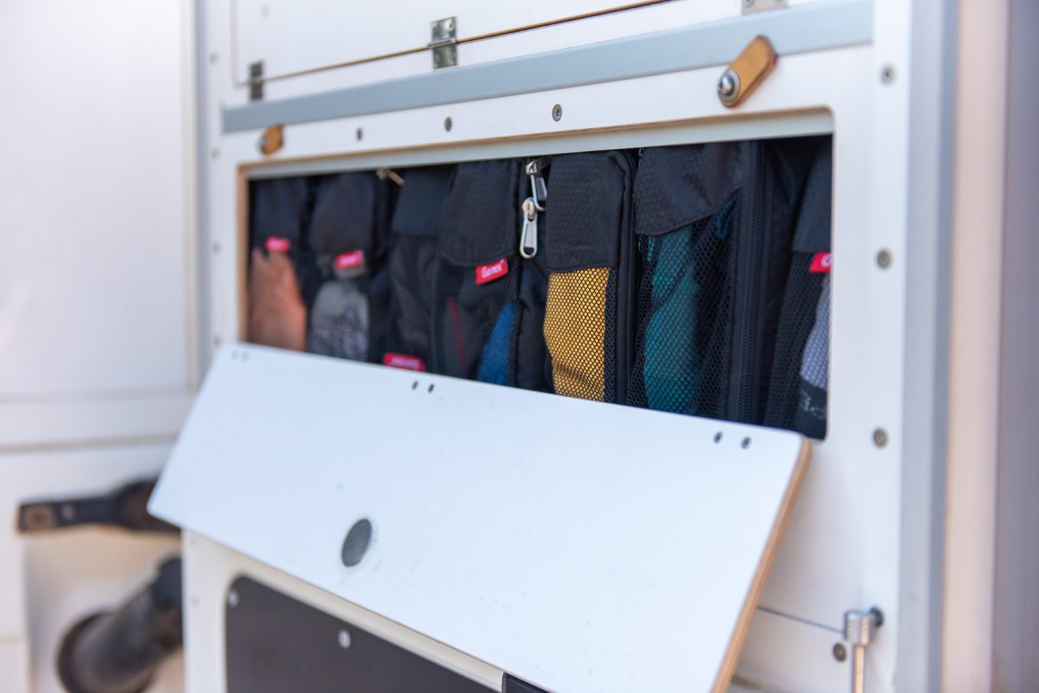 Our clothes fit in the small additional compartment in our rear door. We added a small aluminum extension to the door during construction to gain more storage . . . [where] things are always easily accessible. Only the Gore-Tex pants and jackets for hiking are stored separately.