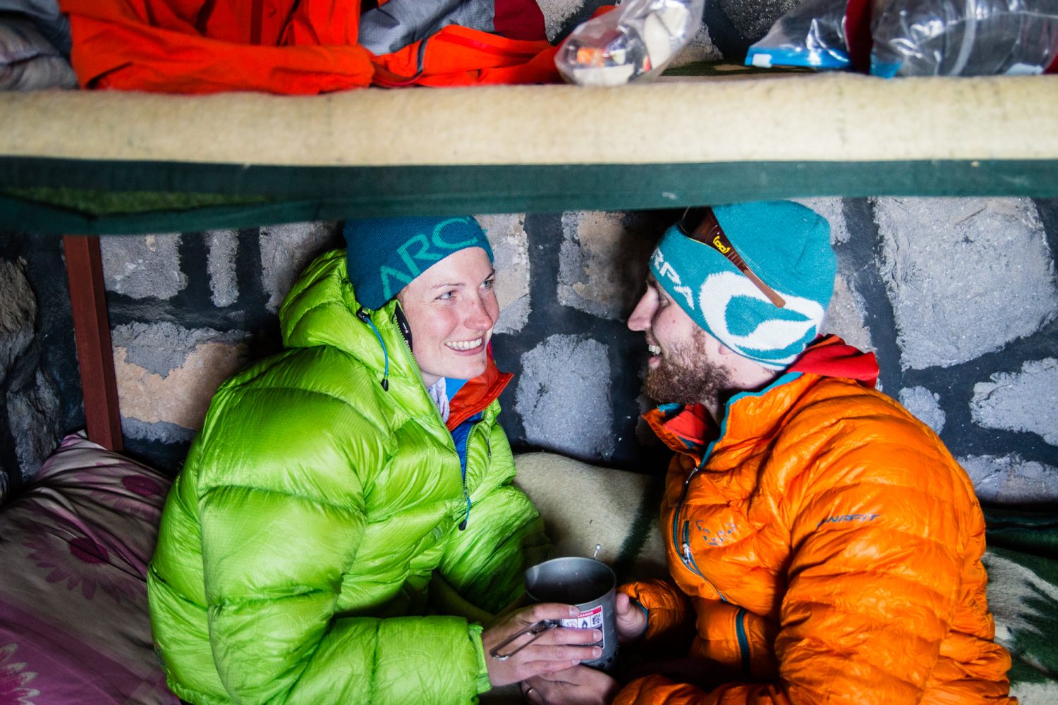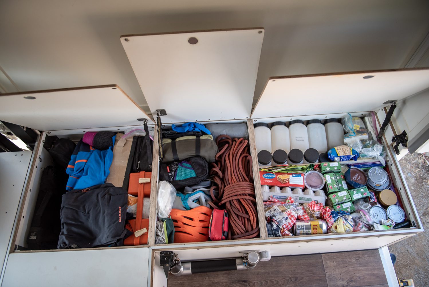 “Climbing and skiing gear probably takes up the most space in our car. One of the big seat boxes in the cabin is filled with mountaineering equipment like rope, crampons, helmets, harnesses, a stove, a tent, and sleeping mats. Things that we use less often, such as the ice screws, very thick gloves, and our thick down jackets, have been moved under the food supplies. Our car is too small to store big things like skis, mountain boots, and ski boots inside. Therefore, we have an additional aluminum box on the roof to take it all with us.”