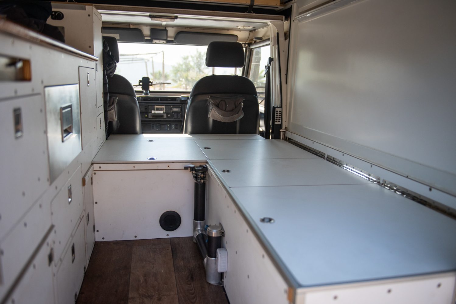 Under the car, we have a homemade aluminum tank, which holds about 45 liters of water that we use mostly for cooking, doing the dishes, [and] showering. In addition, we have an insulated stainless steel hot water tank in the front fender, which is heated by the engine heat while driving.
