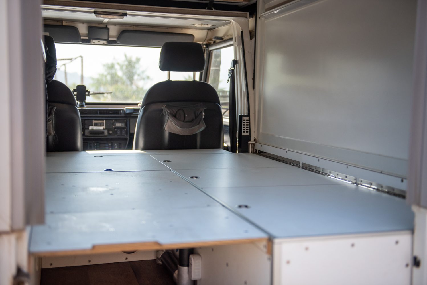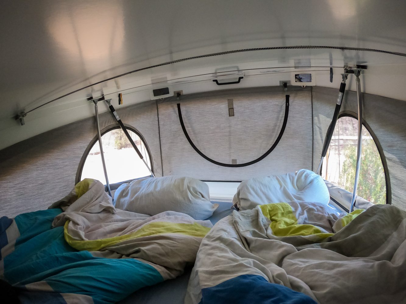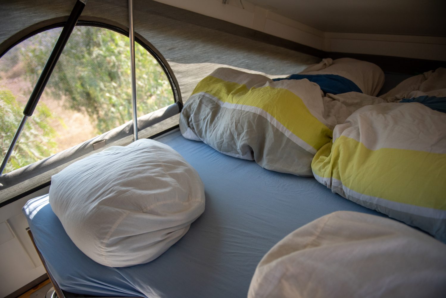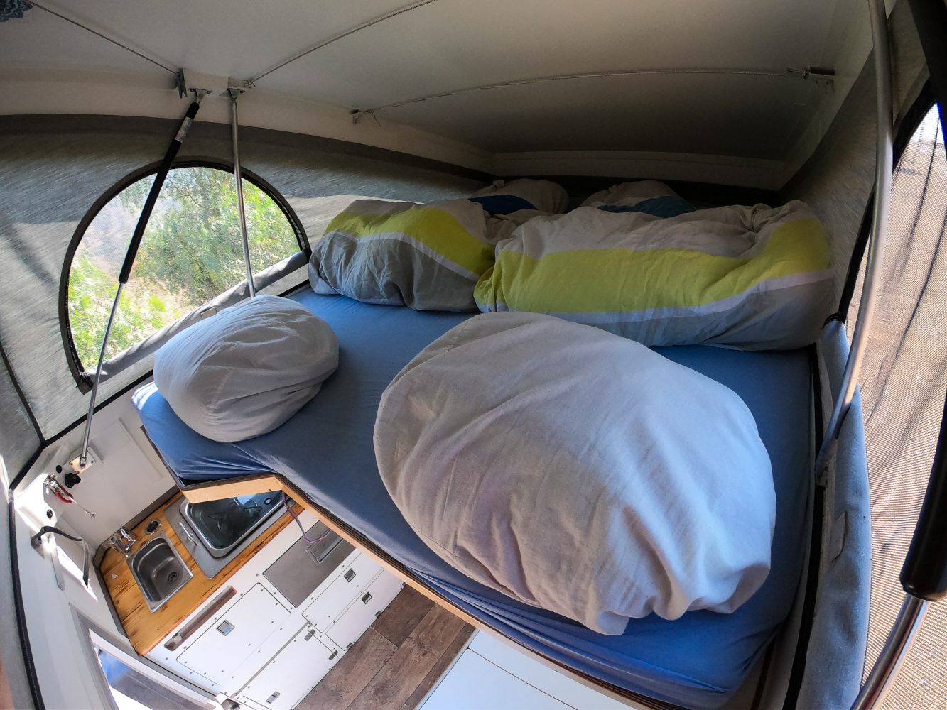 Since we each have two different sleeping bags for mountaineering, we did not want to pack extra bedding. However, we use [the bags] in the car as blankets, and to increase comfort, we have the sleeping bag with a comforter cover and the mattress covered with a sheet. So, except for the fact that the sleeping bag gets a little tighter at the bottom, it feels like normal bedding. During the day, we stow the sleeping bags loosely in two large cotton bags in the alcoves over the driver’s cab.”
