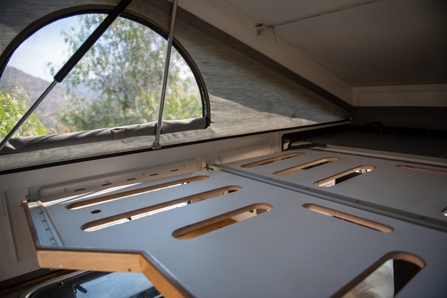 The toiletries are placed in a small drawer under the sink next to the entrance. It was important that everyday objects are always accessible, regardless of whether the roof is open or closed and the bed is built. Clothing, electronics, toiletries, cooking utensils, and the refrigerator [can be accessed] without having to rearrange the cushions.”