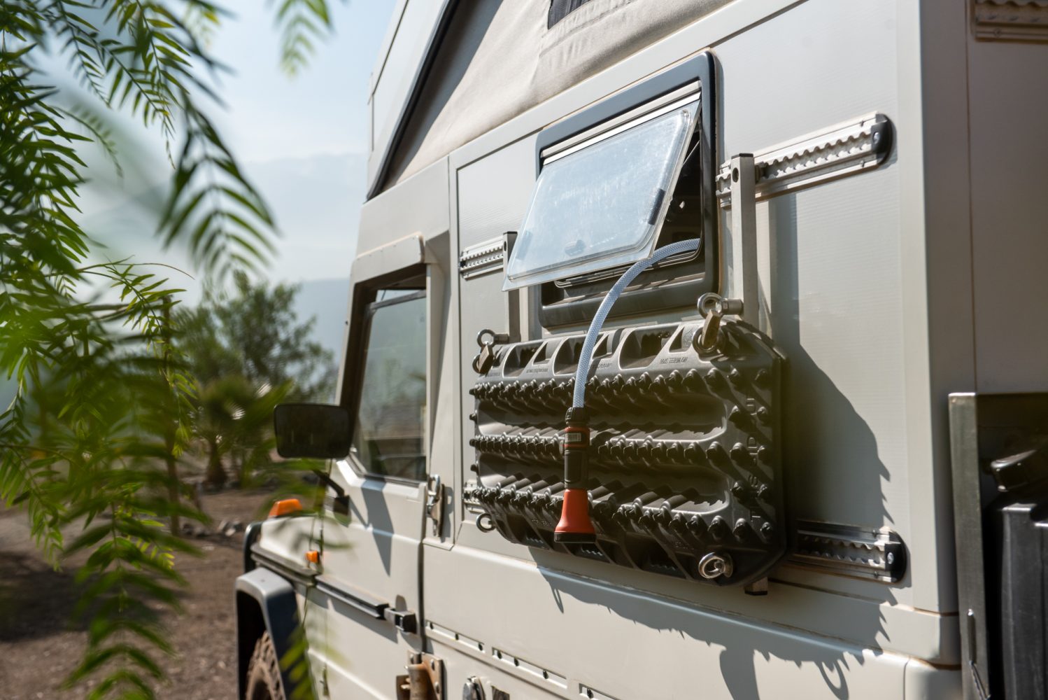 For drinking water, we use two 20-liter Front Runner jerry cans made of polyethylene attached to the outside of the car. We recently started using an Alb filter when filling the tank. In addition, we also have a manual filter from MSR that we use on the mountain and often to filter drinking water. In the future, we want to install the hot water tank/boiler inside the cabin for better insulation. Heating water by using the engine’s cooling system works great, so we want to keep that feature, but we would love to heat the water by using our diesel air heater when not driving.