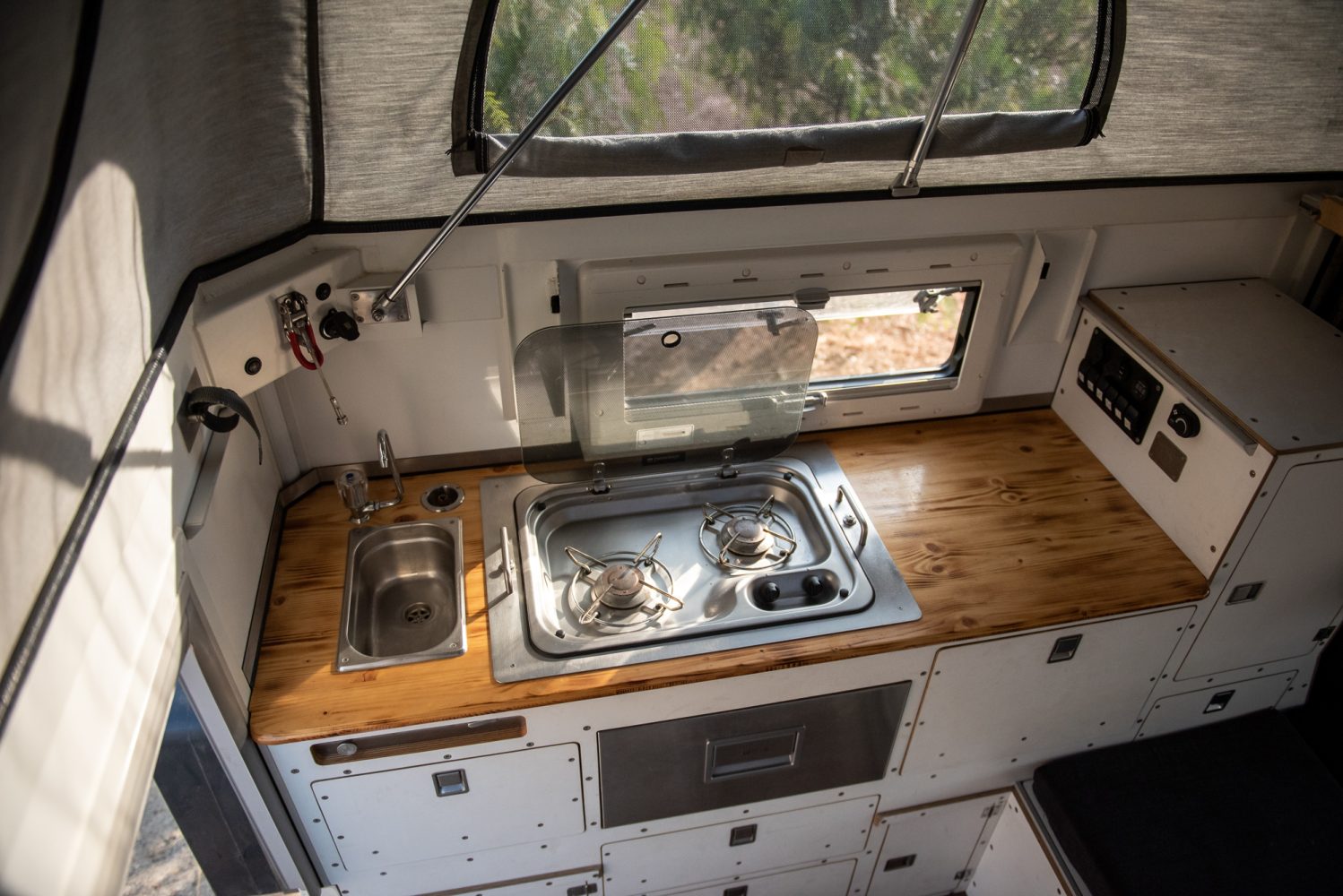 “We have a two-burner propane stove recessed into our kitchen countertop that we can also remove to cook outside. The propane is located separately in a sealed compartment next to the entrance. There we have a 3-liter and a 1-liter bottle, which we can also refill ourselves. Below [the countertop], there are several drawers. In the biggest one, we store all of our cooking utensils like pots, dishes, [and] cutlery. Most of it is made of stainless steel, convenient for camping and cleaning. This setup works perfectly for us, but there is always room for improvement. For example, we have a large pressure cooker to cook at high altitudes. There we would look for a smaller alternative.