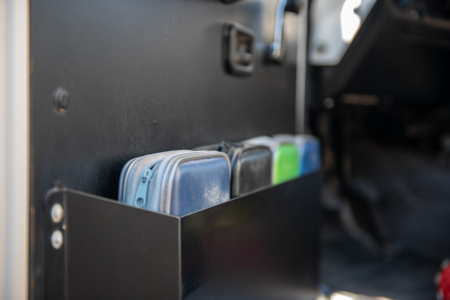 We bought soft organizers to store our electronics, cables, and camera accessories to keep everything in order. Otherwise, they are just in a compartment behind the driver’s seat so that we can get to the things quickly from the front and the back.