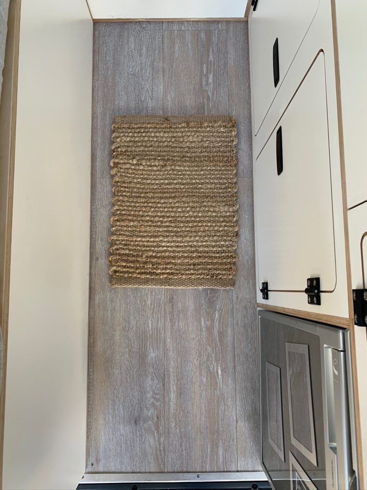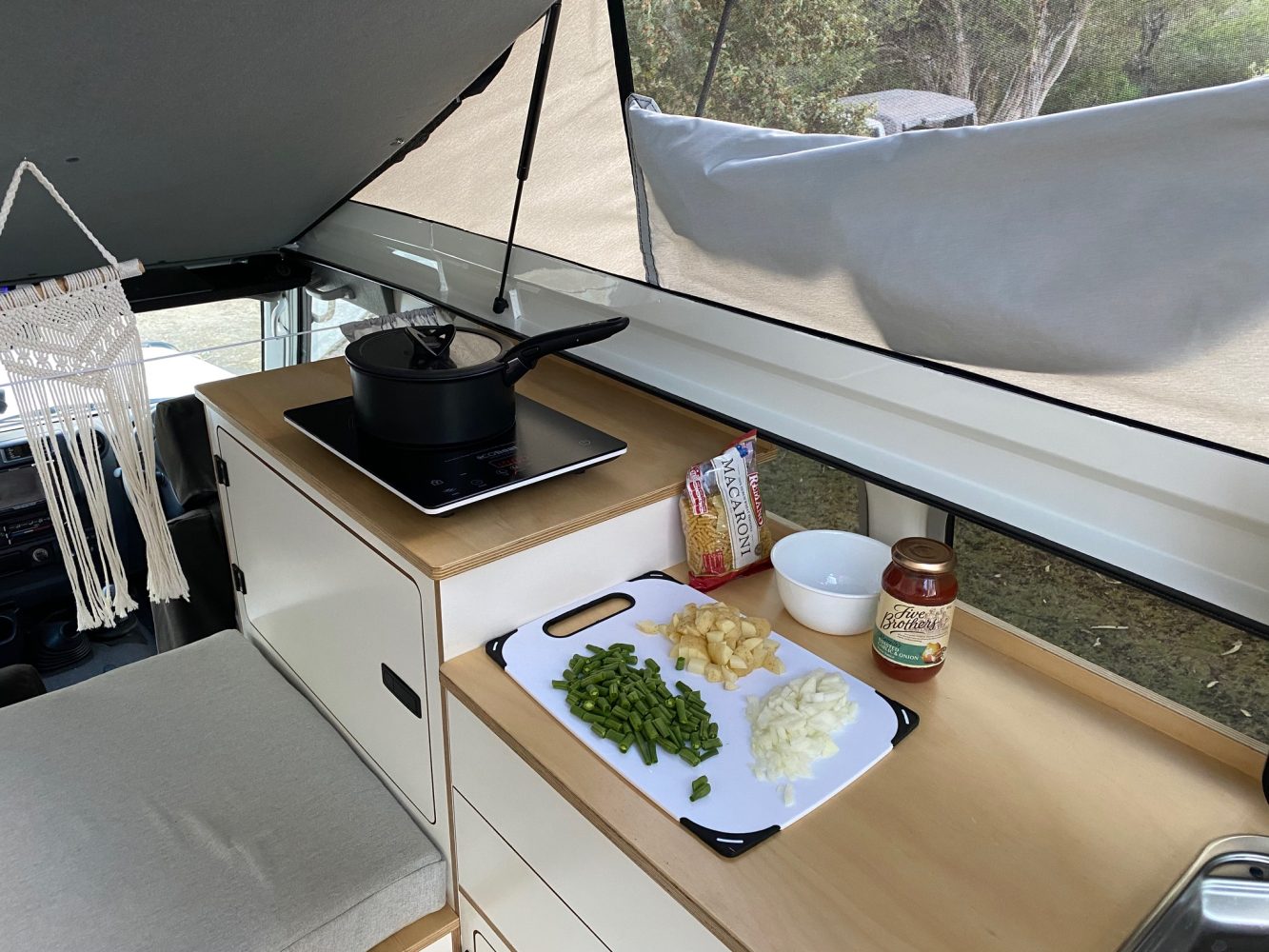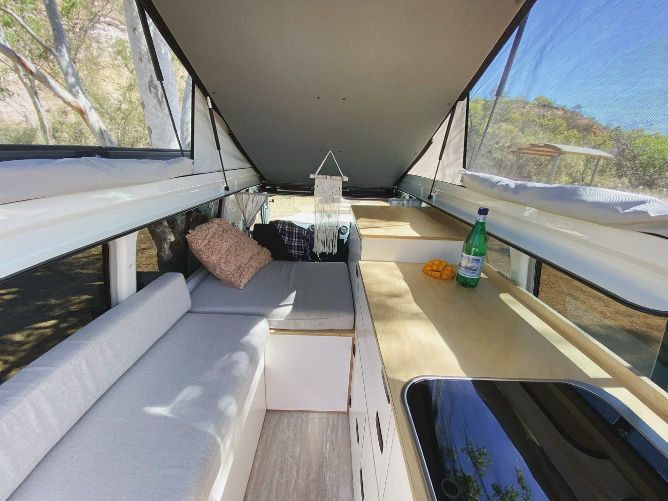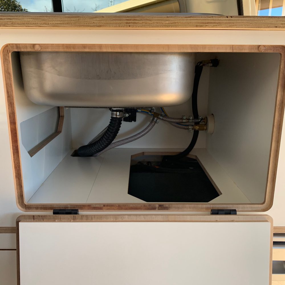 The interior of Calabro’s Troopy is a minimalist’s dream. She stores most items within white timber cabinets, which also house an EcoHeat induction cooktop in the top drawer. An eight-piece titanium Tefal Ingenio Fusion induction pan set is her choice for cookware due to its removable handle and space-saving design. A bamboo cutlery tray holds all cooking and eating utensils, while her Corelle dinnerware set is stored in the second drawer. A Dometic SMEV basin was also installed in the cabinetry.