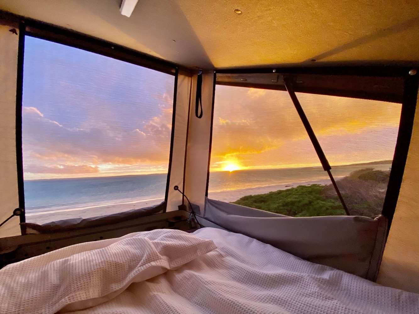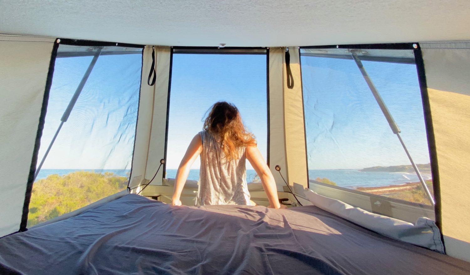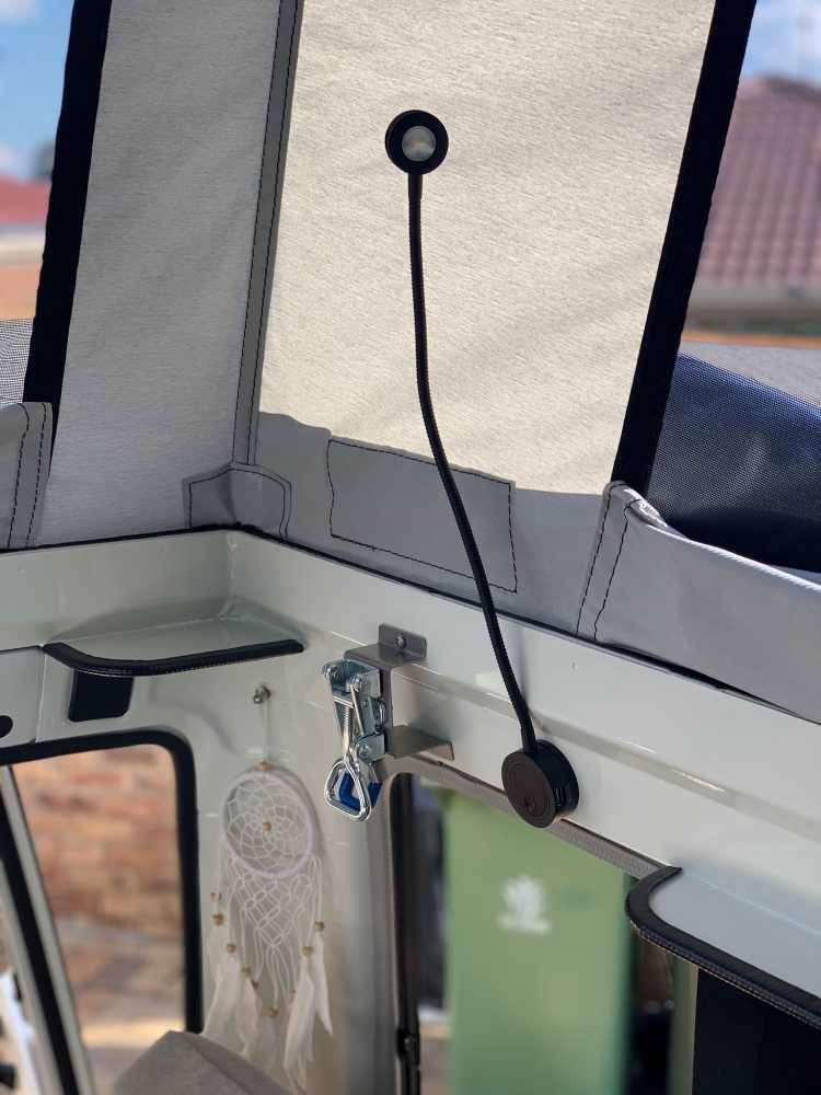 The benefits of the pop-top don’t end there. “Another of my favorite things about the pop-top is the ease of setup/packup,” she says. “I can be driving along one minute and in bed the next if I wanted. It takes 20 seconds to set up and about a minute to pack up.”