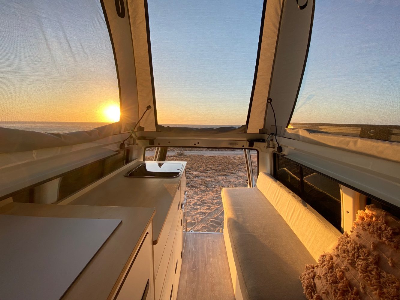 Scrolling through Marlee Calabro’s @troopygirl Instagram account is like a soothing balm for the nervous system. Often parked on sugary sands with aquamarine waters in the background, her white Land Cruiser VDJ78 Troop Carrier’s interior is so clean, so minimalist, and so well-laid-out that it has inspired the interior design of a handful of Troopy builds in the US. The view from the Mulgo pop-top bursts with unimpeded views of Australian beaches and sunsets, while white timber cabinetry and vinyl flooring lend to a delicate feel, contrasting with the rugged style of overland builds that we’re used to.