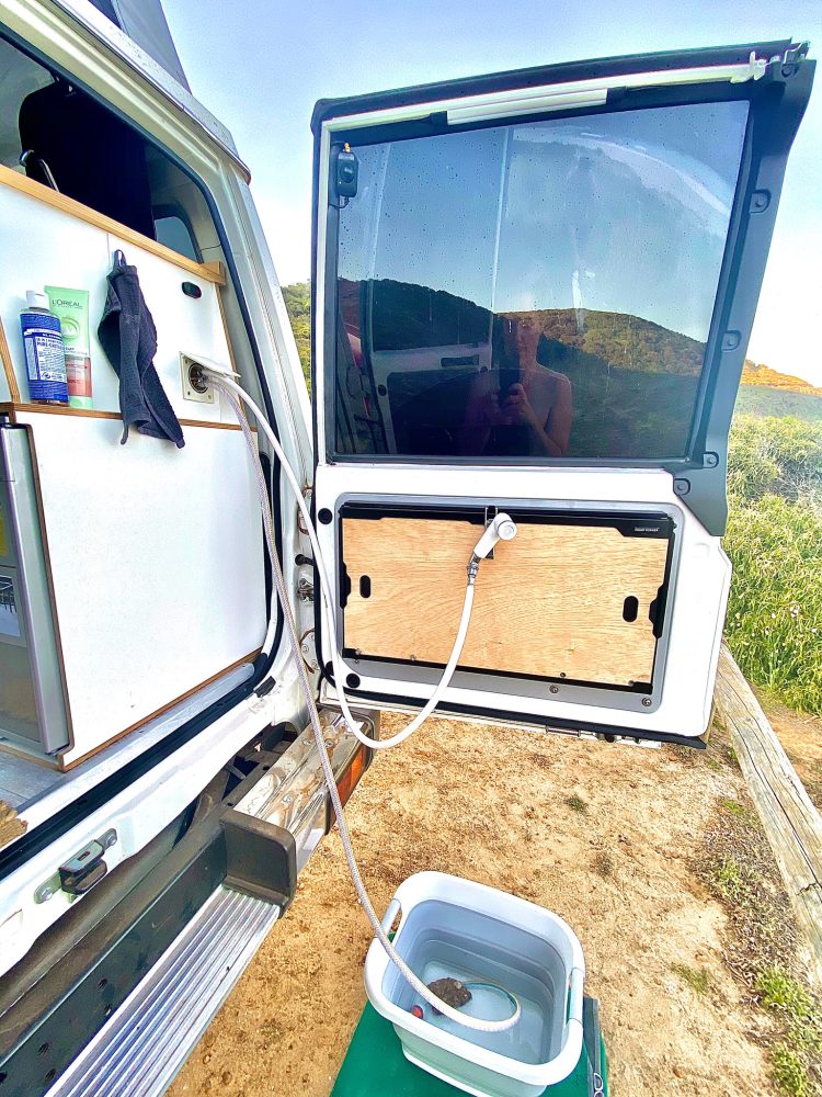 The Troopy’s solar system includes two 120-watt solar panels mounted on the roof, an iTechWorld 140-watt solar blanket, a 200Ah Enerdrive lithium battery, a 2,600-watt Enerdrive inverter, an Enerdrive DC to DC 40Ah battery charger, and a 12-volt smart charger. “The powerpoint [is] located behind the driver’s seat; I should also put one at the rear of the vehicle by the water pump switch,” Calabro explains. “I do most [of the] cooking on the rear door drop-down table and currently run an extension lead from the powerpoint behind the driver’s head.”