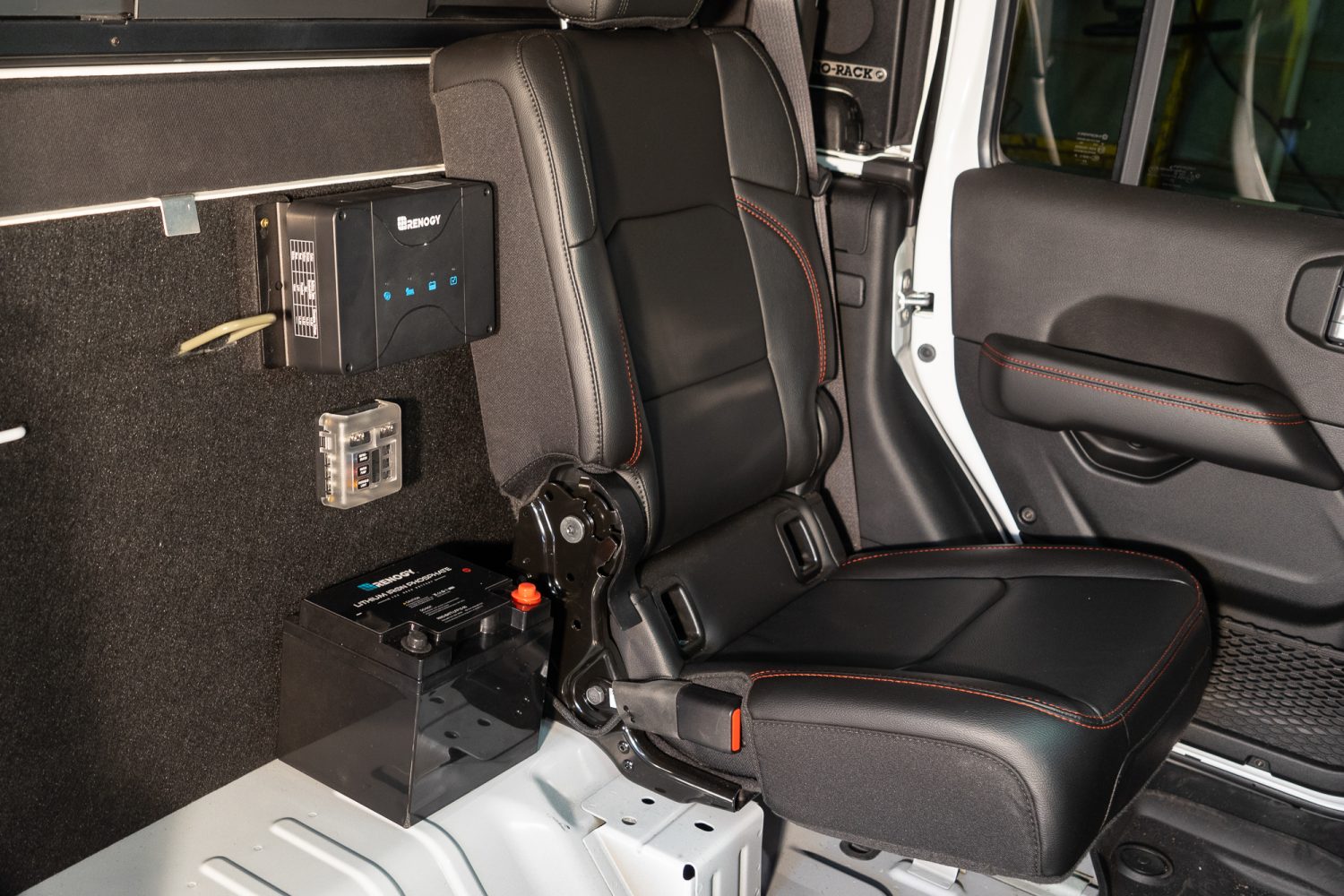 Legally transporting three people instead of my usual one caused a few pivots in the design, ultimately resulting in a 60 percent rear seat delete. In the remaining rear seat area, I designed a secure cabinet for delicate electronics and camera gear. Inside the cabinet is a slew of charging ports to keep multiple batteries topped off for quick change-outs in the field.