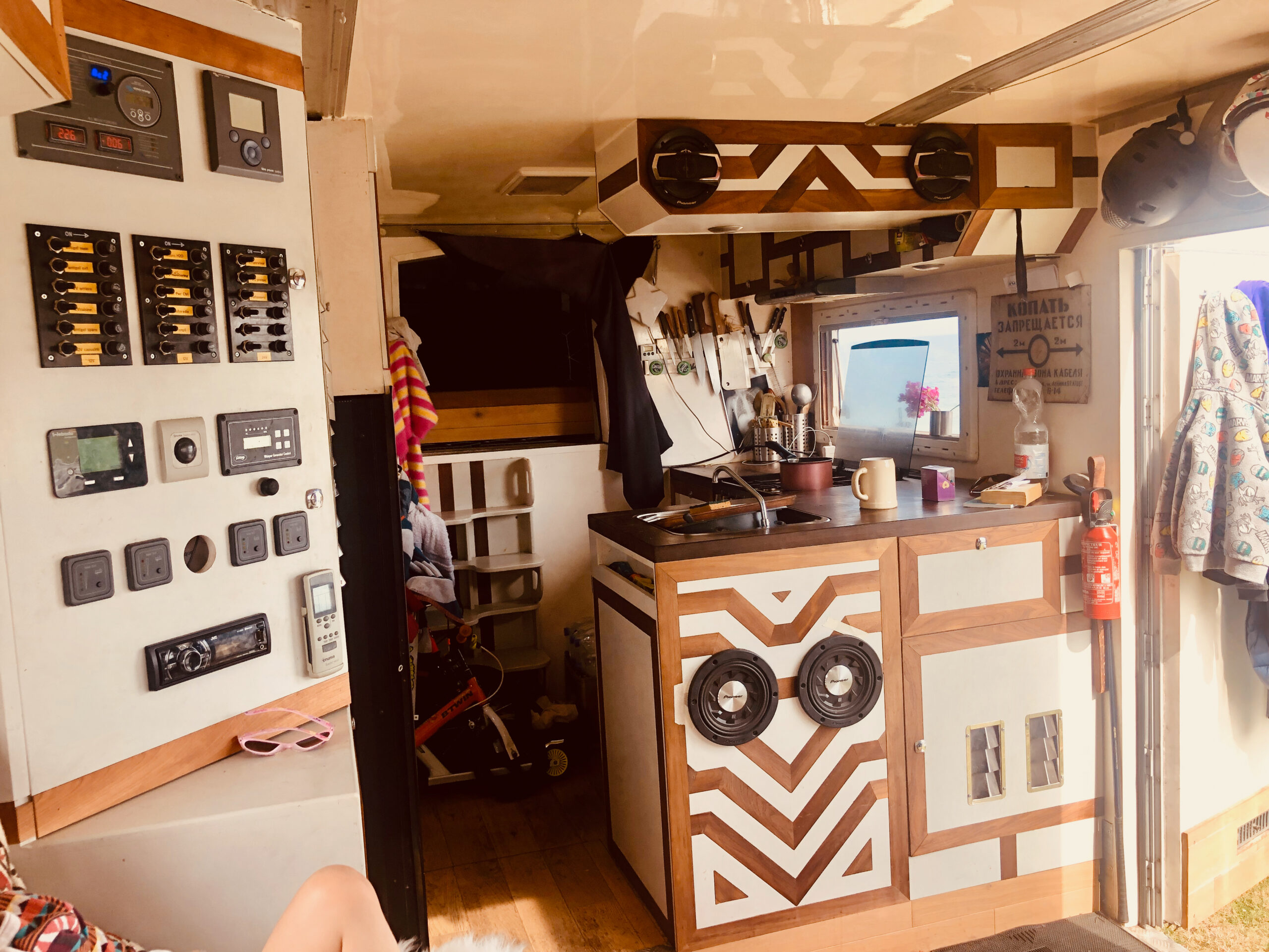 Heating, air conditioning, 24-volt power, an inverter, a generator, and all tanks (clean, wastewater, and fuel) are monitored via a central control panel. The MAN Kat 1 has three fuel tanks (280, 380, and 420 litres) and a 640-litre water capacity. “Our children learn that electricity, heat, and water are limited,” Boris explained. “Sure, we have almost 700 litres of water, which is good for a truck, but small for a house. Lots of people tell me, ‘Oh, it’s criminal to drive something like that with the climate crisis,’ and it’s true in some respects, but they overlook that we’re powered by the sun, we source and filter our water, and for the most part, we’re self-sustaining when stationary.”