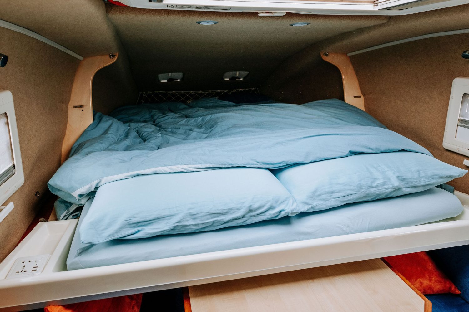 The first steps to transform Marcel and Chiara’s bare-bones living space included cleaning and painting the walls, applying foam, installing water pipes, and reinforcing the existing structure where needed. A 150-liter freshwater and a 30-liter greywater tank were installed in conjunction with a filtration system that activates during filling and when used by any appliances. To power electronics such as fans, programmable RGBW LED strips, and a set of conventional LEDs on separate circuitry, Marcel wired up a Master Volt 200Ah lithium-ion battery, a DC-DC converter, and 240 watts of flexible solar panels. “In my case, I’ve implemented most of the features and devices you would usually find in a purpose-built 7.5-ton expedition vehicle, but with the intricacy that everything needed to fit in the much-reduced space available and be super light. That was a real challenge.”