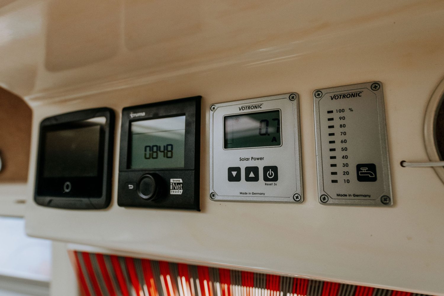Rear only for storage, Dometic CoolFreeze CF16 fridge, supports for iPad, phones, and Garmin inReach, Switch Pros 8 power panel system, Dometic PP402 220V inverter, etc.