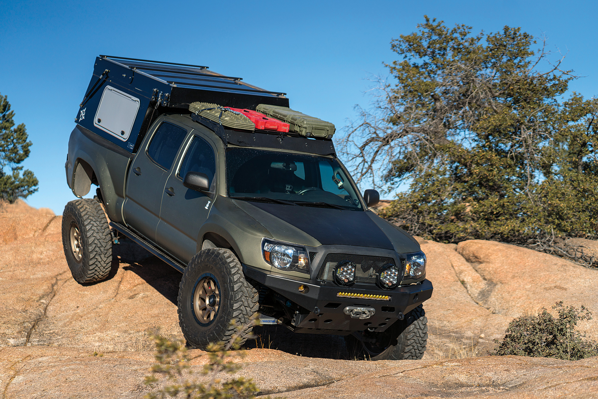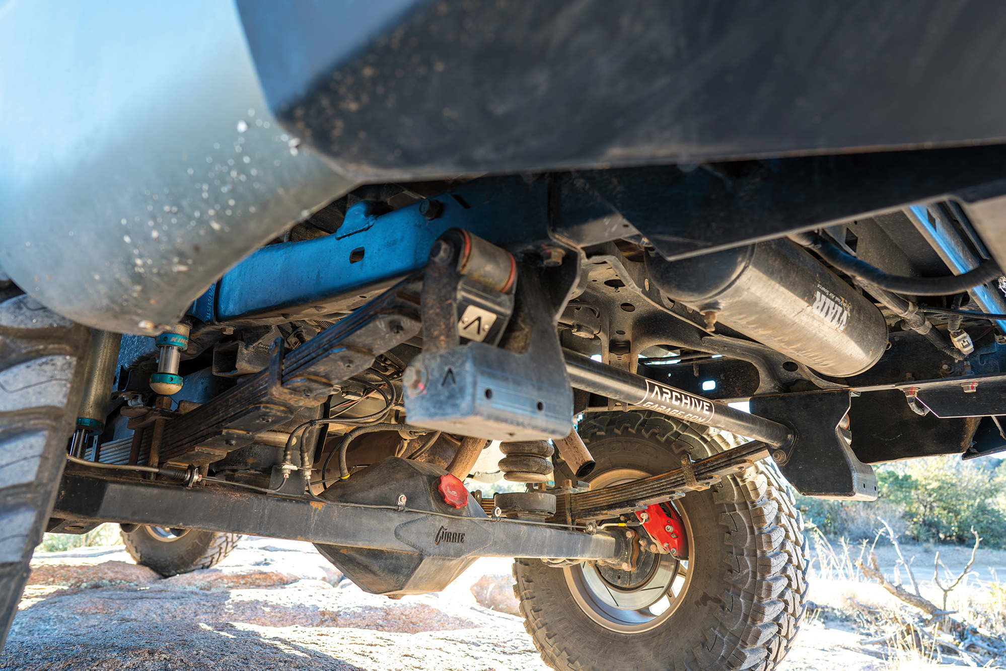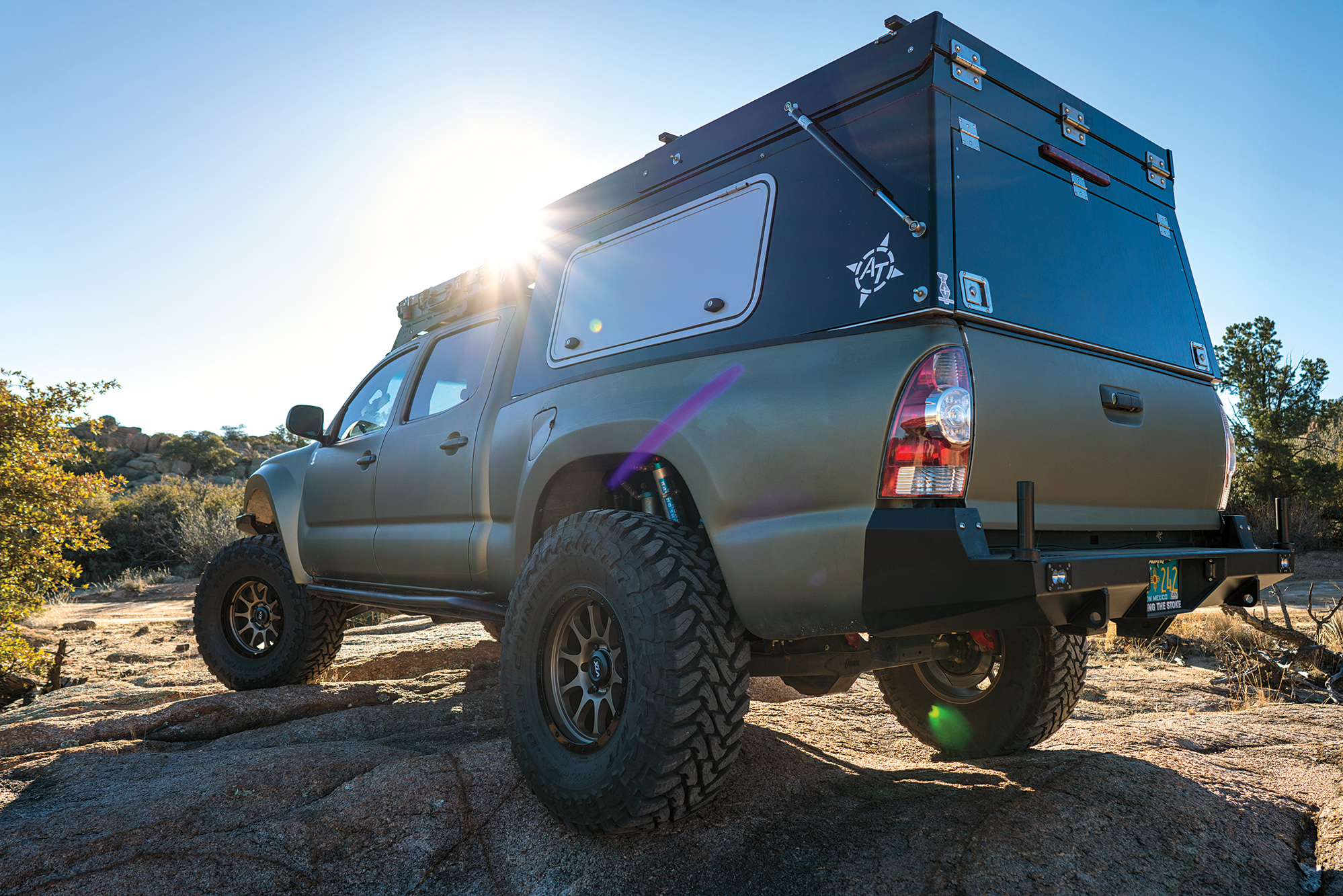 Every overland vehicle is only as good as the base vehicle it is built upon, and there are few North American platforms as respected as the Toyota Tacoma TRD, this particular unit being a Sport 4-door long-bed. The stock 4.0L V6 was augmented with a Magnuson supercharger, the results of which significantly increased horsepower and torque, and added that classic gear spooling whine. It is typically best to leave an engine stock, but Walt has found this unit to be reliable with long-term use. The results are impressive, and with the 5.29:1 axle gearing, I watched Walt drift this truck the length of a football field on private property outside of Tucson, Arizona. Acceleration is strong, and the boost helps mitigate loss at higher elevations. To accommodate the increased power and 37-inch tires, the TAV team specified a 69-inch Currie F9 rear axle. The wider track width helps to offset the higher center of gravity, and the stronger housing ensures the Tacoma can bear a full payload. To match the rear, a Total Chaos 3.5+ inch, long-travel front suspension was installed, along with longer RCV axle shafts.