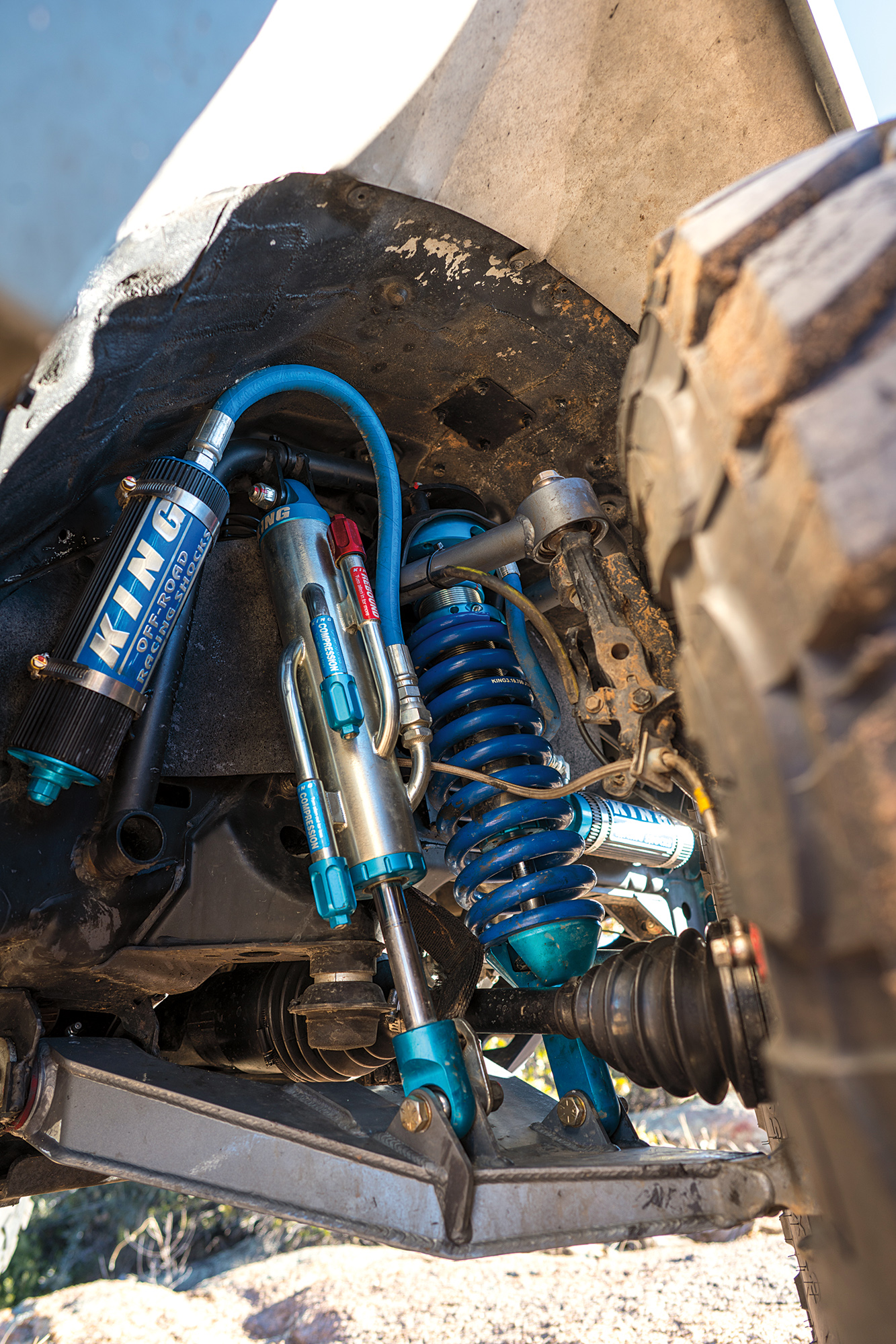 The Tacoma as shown is slightly over factory GVWR, which Walt attempted to remedy by installing a stronger rear axle with a larger ring and pinion, better bearings, a more robust housing, more powerful SOS, and 4-piston billet calipers with slotted StopTech rotors. The independent front was also improved with Total Chaos (wider) arms, and King shocks with 700+ pound coils. The axle shafts were swapped to custom RCV units, along with 5.29:1 axle gears. The front brakes were also significantly improved with an SOS performance big brake kit, featuring StopTech 6-piston billet calipers. The frame was also strengthened with an Archive Garage Hammer rear shackle hanger cross brace. The rear suspension is a combination of custom, TAV-spec Alcan leaf springs with a 800+ pound rating, augmented by a Firestone floating airbag kit, a Total Chaos rear shock relocation kit, and King remote reservoir shocks, along with 2-inch air bumps.