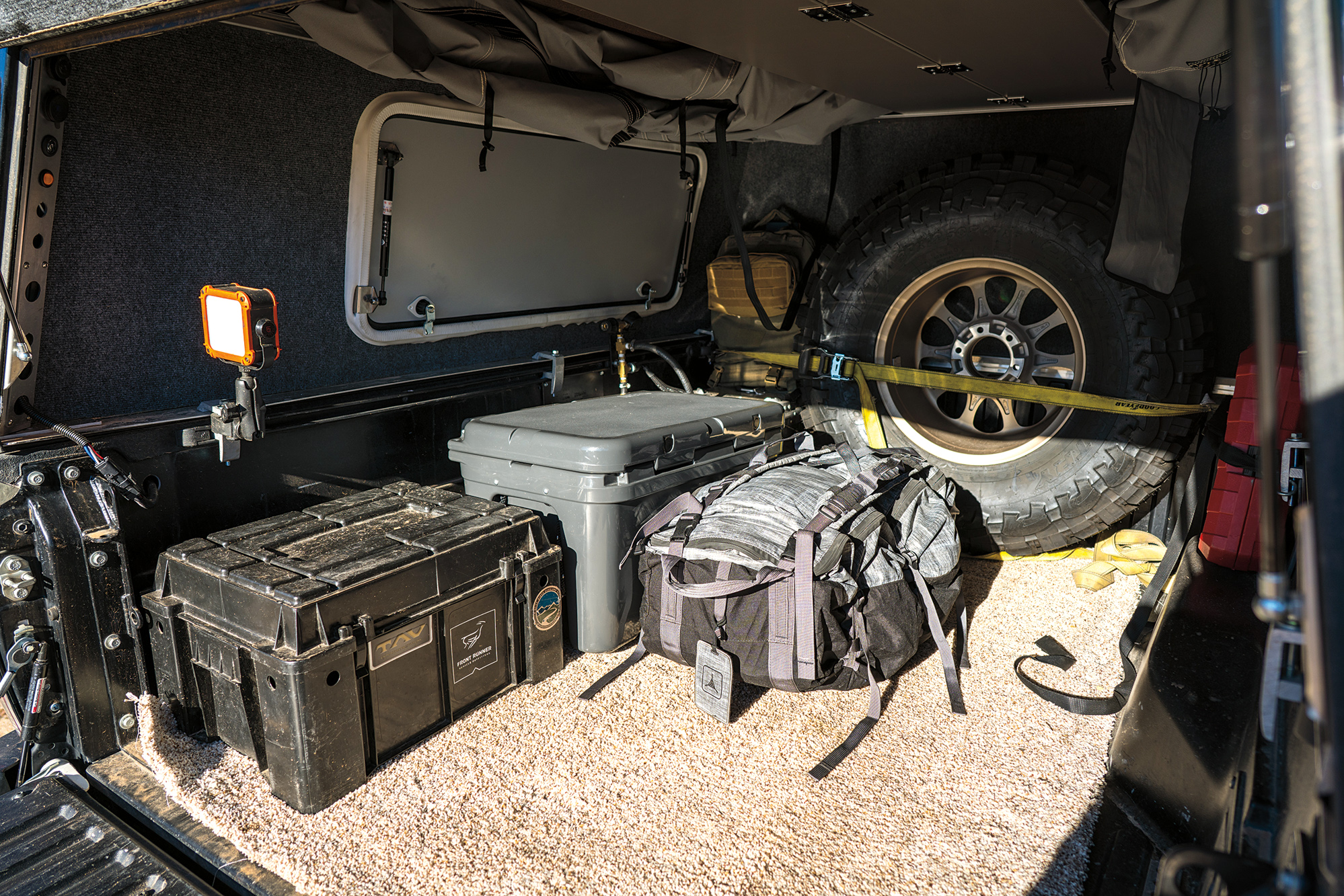 This Tacoma is not just a trail monster, but also an exploration platform. To support Walt’s overland excursions, he installed an Adventure Trailers Overland Habitat camper, and organized the interior with a series of Wolf Packs, a Yeti cooler, and a few Triple Aught Design duffels. Thoughtful details continue to the cab, with a Rammounted navigation iPad, sPod control panel to operate auxiliary lights, a simplex VHF radio, and a Sony head unit. This is easily a vehicle that can be lived out of for days or weeks at a time.