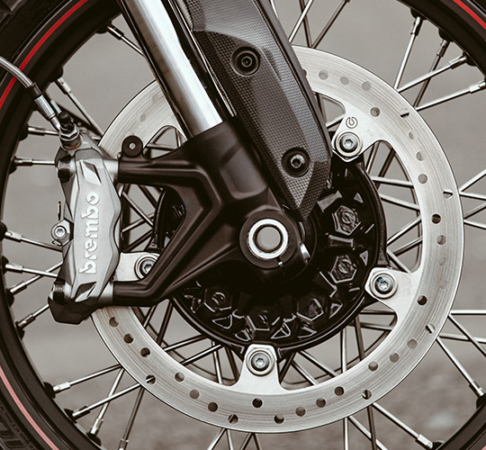 Brakes: Front/dual 320mm x t5 rotor with 4-piston calipers, rear/single 265mm x t5 rotor with 2-piston calipers