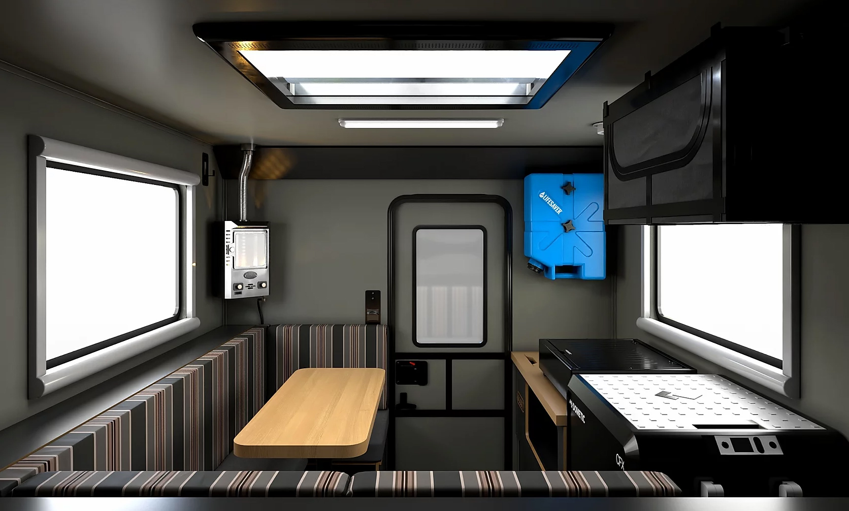 Unlike its predecessor (the Olympic), the Scout Yoho does not have a pop-top which means that it has a slightly smaller maximum sleeping capacity of 4 people. This is achieved with the combination of an almost full-sized permanent bed and a convertible dinette. While this may sound cozy, it’s utilitarian by design.