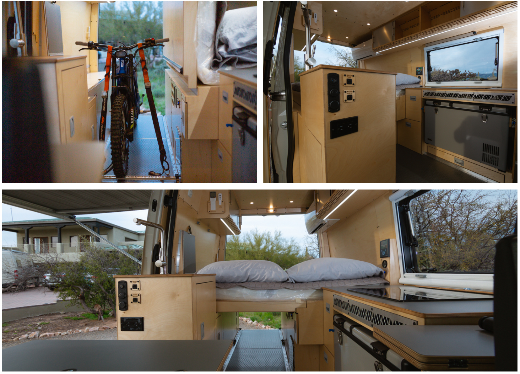 One design feature that will immediately stand out to anyone who’s researched Sprinter upfitters is MVAV’s hinged bed design (on their premium model), which allows the rig to accommodate a (small) motorcycle inside the vehicle. There are a whole host of benefits associated with this approach, the first being enhanced security: your motorcycle (or bicycles) are less vulnerable to theft inside your van. Another major benefit of this approach is improved vehicle handling that comes from shifting cargo mass toward the middle of the vehicle. The cargo area comes with L-track to make securing your load quick and easy.