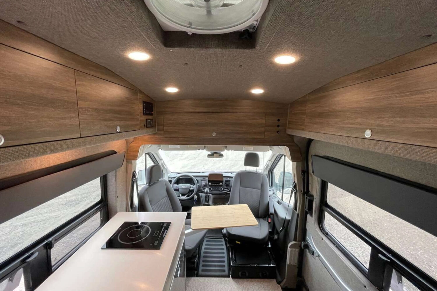 The vehicle’s rear bench seat converts into a 50-inch by 74-inch sofa bed, and a modular Lagun table provides an adaptable surface for dining or working. Systems capacities are identical to the Lemolo, as is the gas or diesel hot air heating system. Starting price: $49,500, vehicle not included.