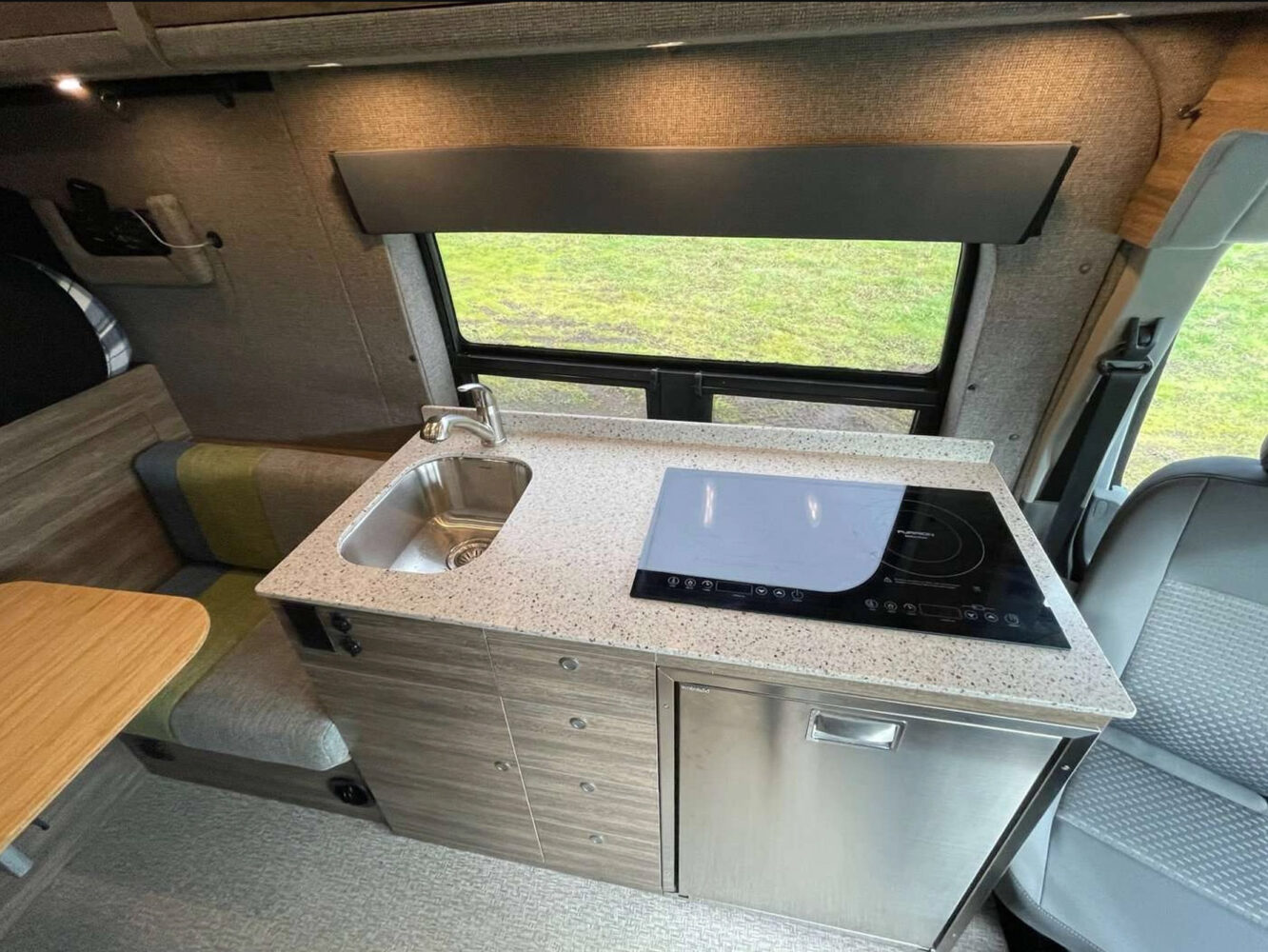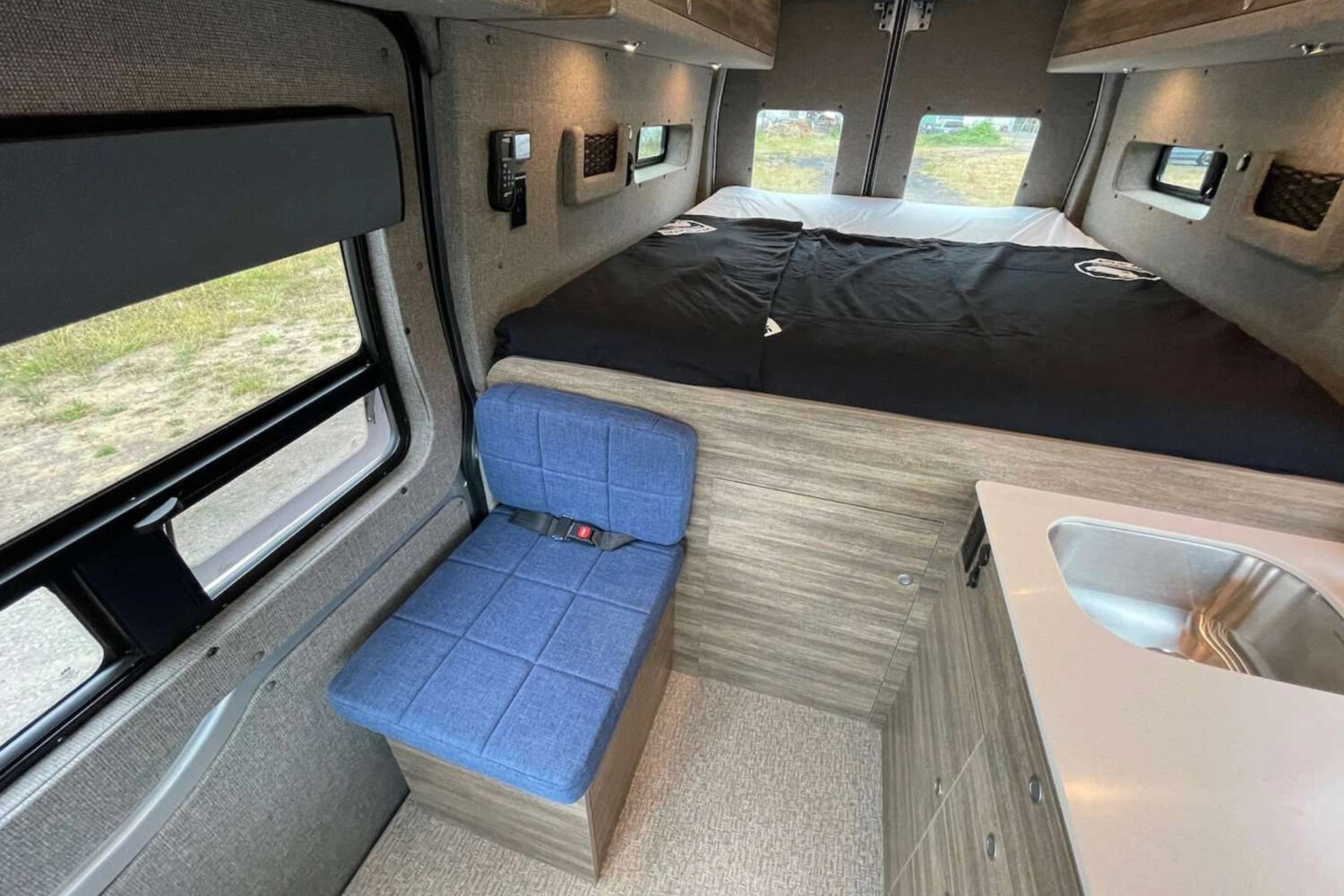 Van Haus offers three pre-designed campervan layouts to fit a variety of travelers’ needs by prioritizing between storage space and belted passenger seating. All three feature a driver’s side galley with a refrigerator, sink, overhead storage, noise-reduction mat, and four-season insulation. But this is where the similarities end.