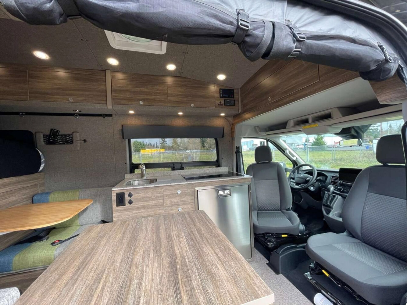 It features a pull-out bed platform with a queen-sized mattress, dedicated dinette area, 200 amp-hour lithium battery system with roof-mounted solar, and hydronic heat with continuous hot water (gas or diesel-powered when off-grid).