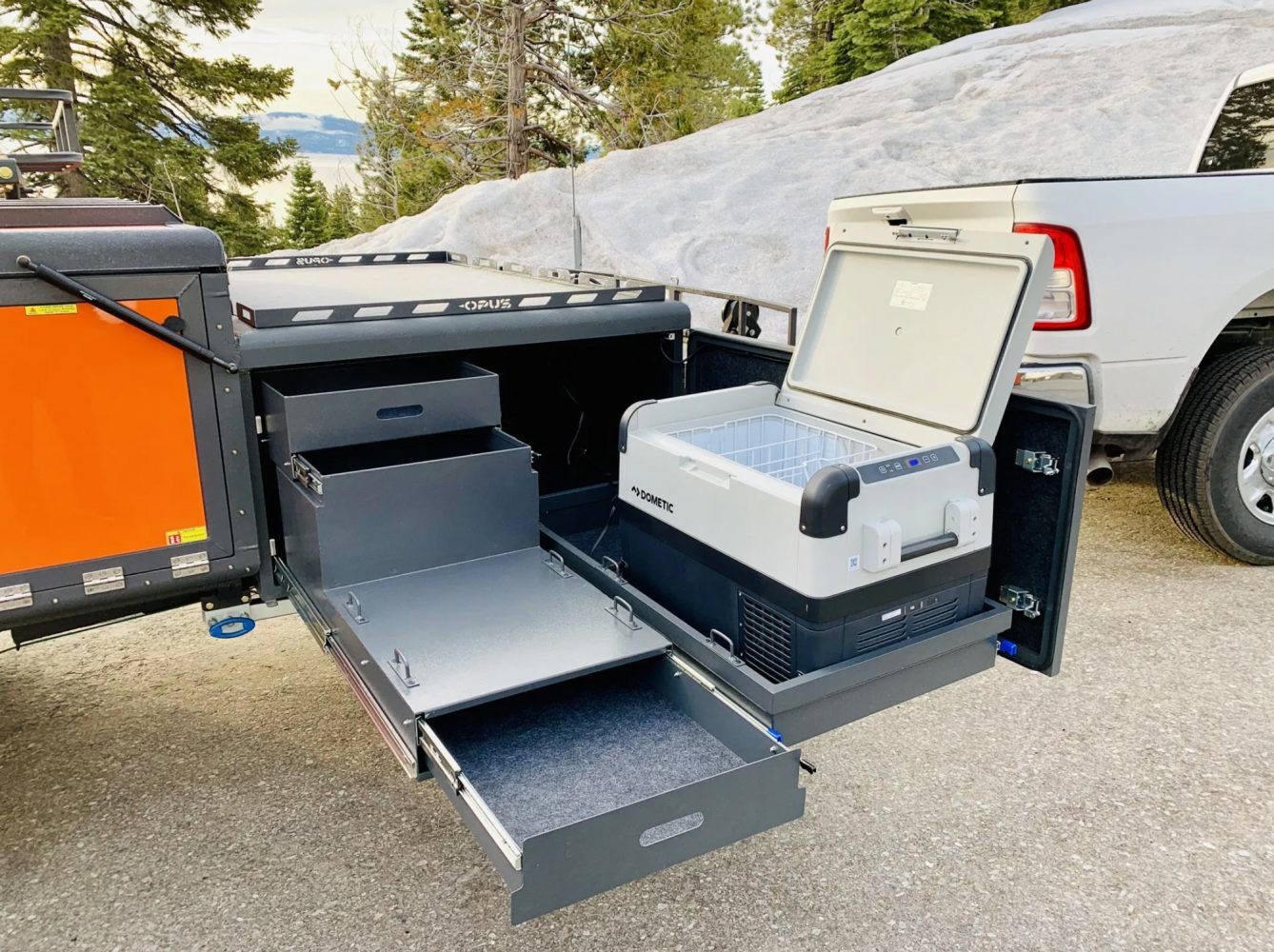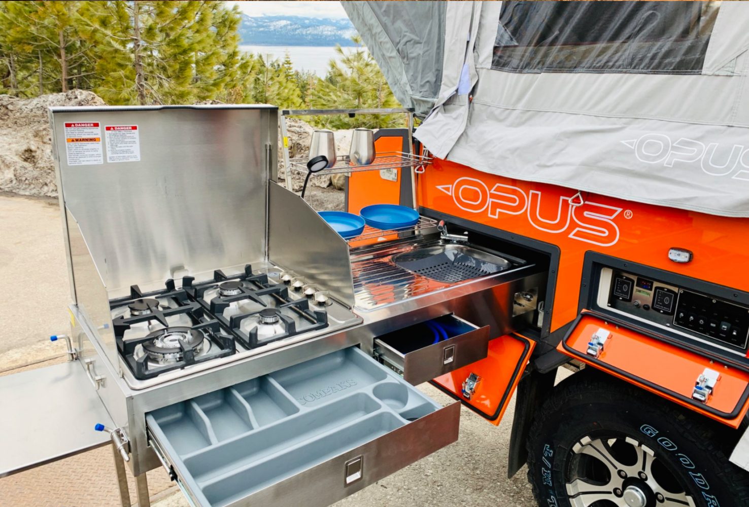 Two exterior slide-outs create a spacious outdoor kitchen prep area. The OP2 comes standard with a four-burner LPG range and sink combo and a Dometic CFX-50 refrigerator. One additional exterior slide-out compartment can accommodate camping gear or similar. If extra storage space is needed, a foldable cargo rack with a 500-pound capacity is an available option. A hot-water shower and a 20-gallon freshwater tank complete this off-highway home.