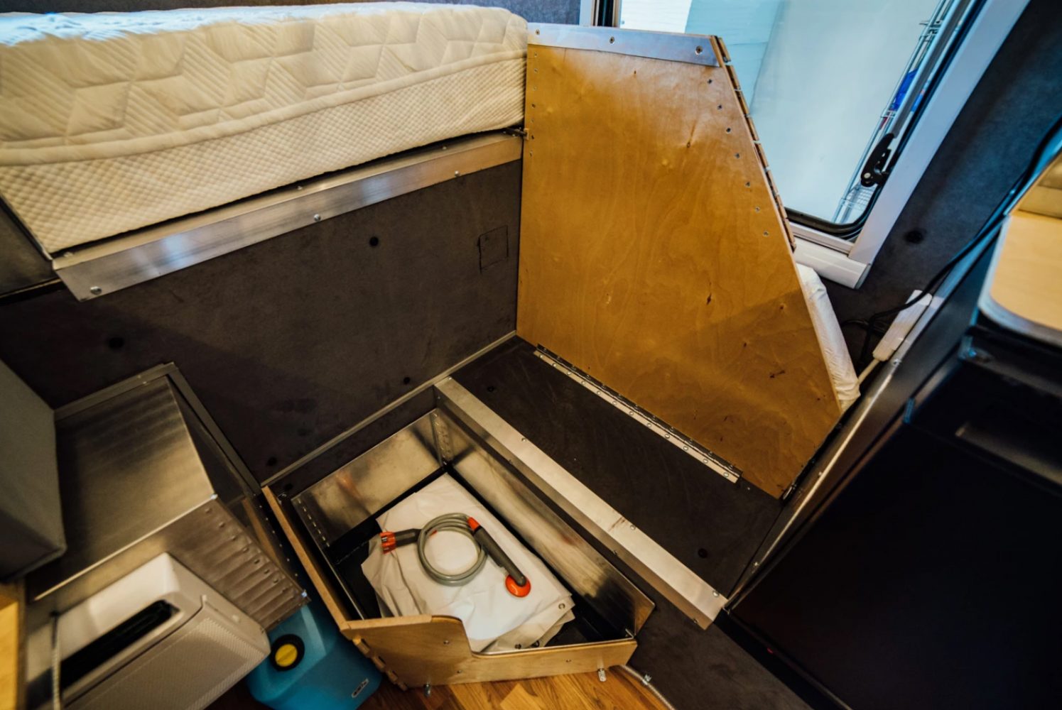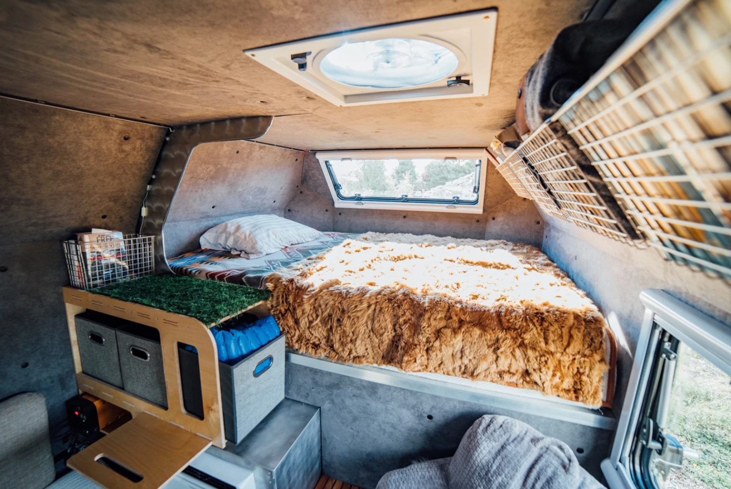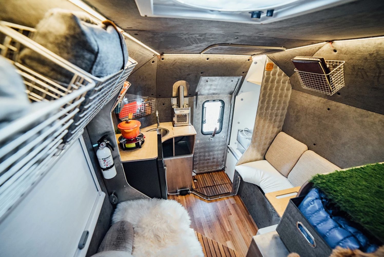The all-metal exterior of the “Kimbo 6 Base” belies its sub-1,000-pound weight, which is achieved through a frameless design. Instead of studs or steel beams, its strength comes from the riveted and sealed geometric panels, a design that allows a modest interior square footage in a 6-foot length (hence the name, a reference to the 6-foot truck bed).