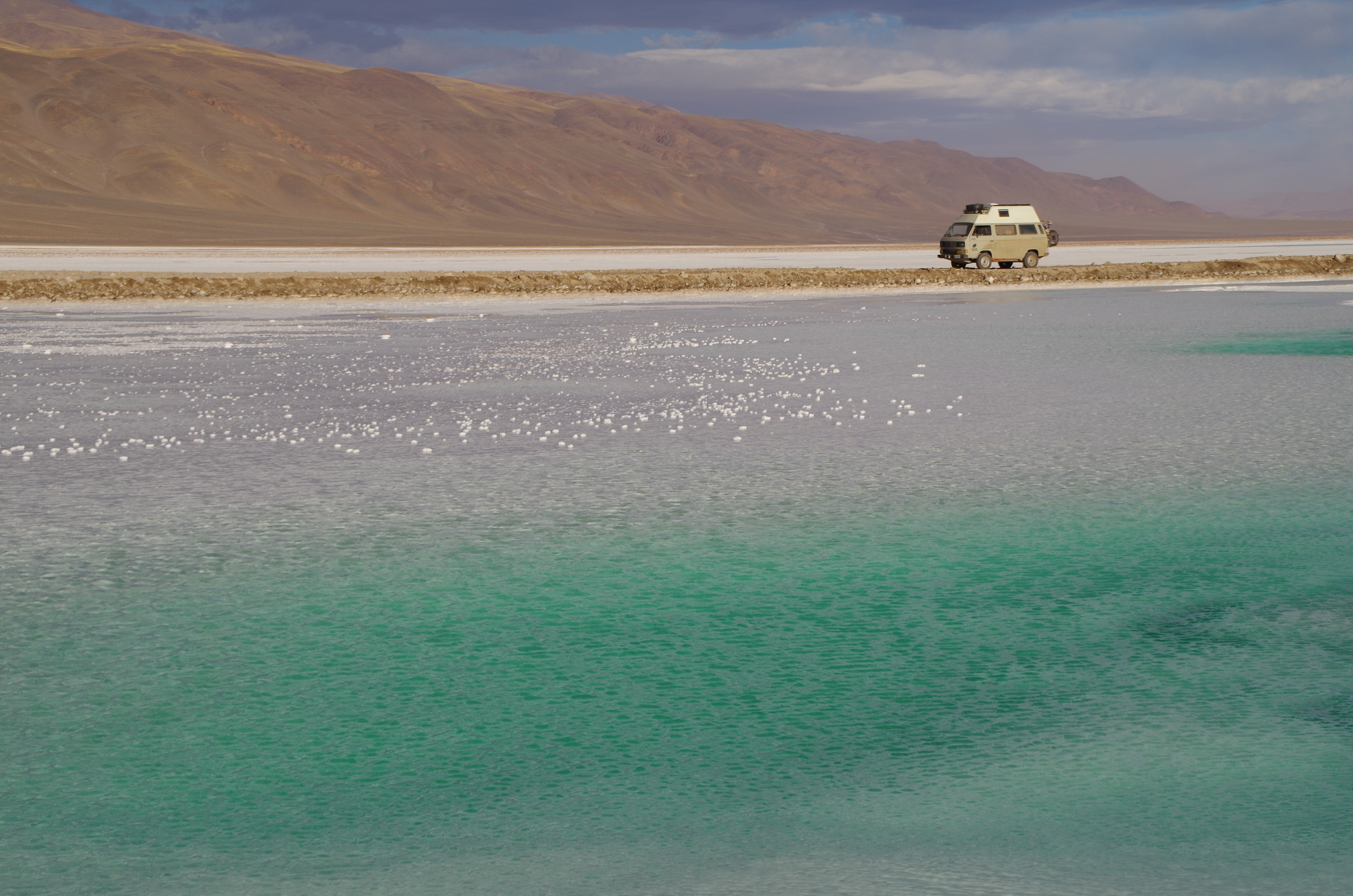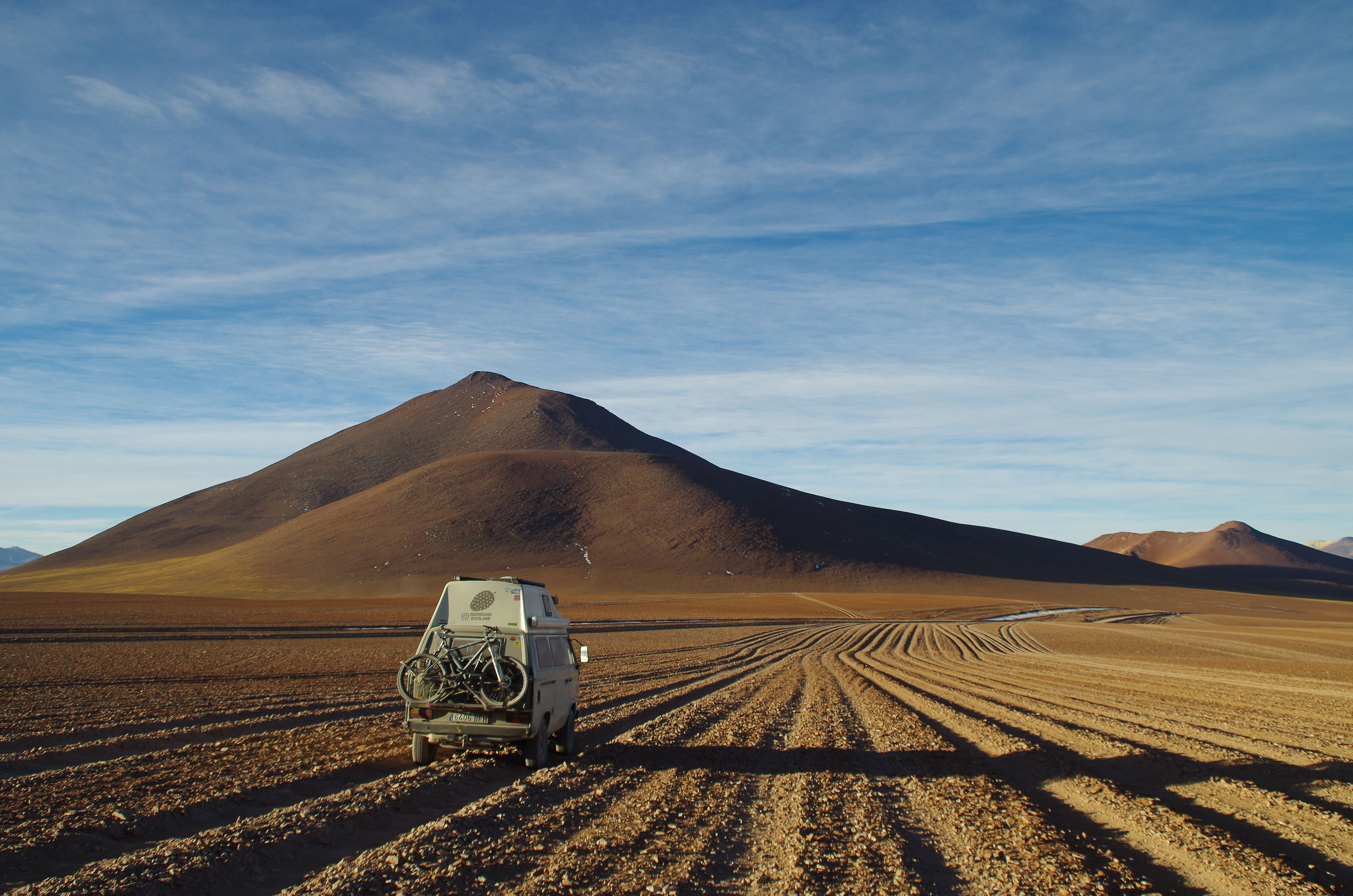 I think the Lagunas Route in southern Bolivia. This ‘road’ is accessed from Chile or Northern Argentina and is located in southern Bolivia. It is a very high plateau, completely deserted, not even a tree for hundreds of kilometres. You drive between volcanoes, geysers, and many different coloured lagoons: green, red, white, blue, black. The route takes you above 4,000 metres (reaching 5,000 metres in the Argentinian section), and the scenery is very dramatic, but the elevation is challenging. The tracks are very rough, but the main issue is that if something were to go wrong, it’d be very difficult to get help. There are whole days not seeing anyone, no village or road. Nothing. Thus, you have to be very gentle with the vehicle. It was also super cold at night; at one point, it was -15°C (5°F). In the end, everything went smoothly, but beforehand, I was worried about the van’s reliability. That said, a turbo-diesel engine, like ours, is not so problematic at high elevation. It’s worth noting that a modern vehicle can have more issues at this elevation due to the various electronics and sensors; I spent time with a family in a newer Sprinter, and they had many mechanical problems, including filters getting clogged due to lack of oxygen.