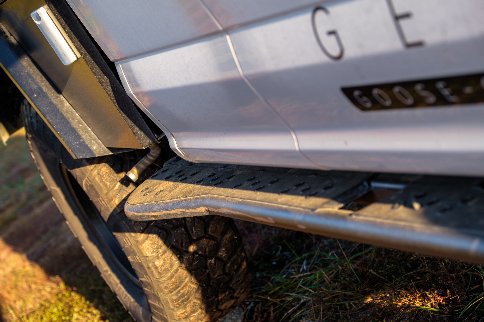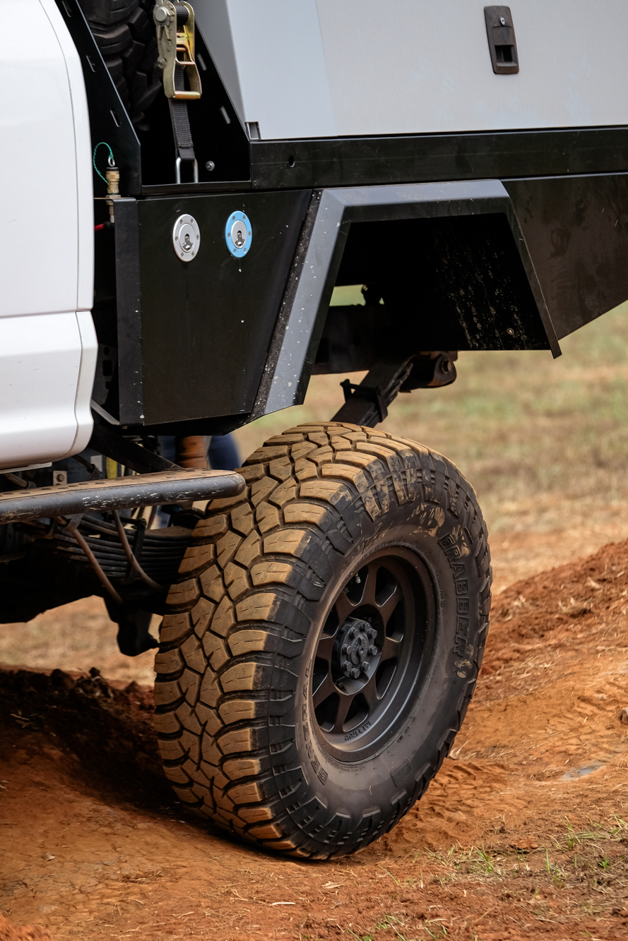 Although Goose Gear’s F-350 is one of the shortest super-duty models available, it still has a 148-inch wheelbase, which means that armor is going to be important, especially around the rocker panels. Unfortunately, sliders for these trucks are few and far between, so Brian turned to the folks at Castle Fab for a build-to-order set capable of withstanding some serious trail shenanigans. “I wanted something as strong as an ox, and Castle definitely delivered. I’ve dropped the truck on the sliders and literally spun the vehicle sideways around a boulder without damage, and I’m sure I’ll wind up doing it again.”