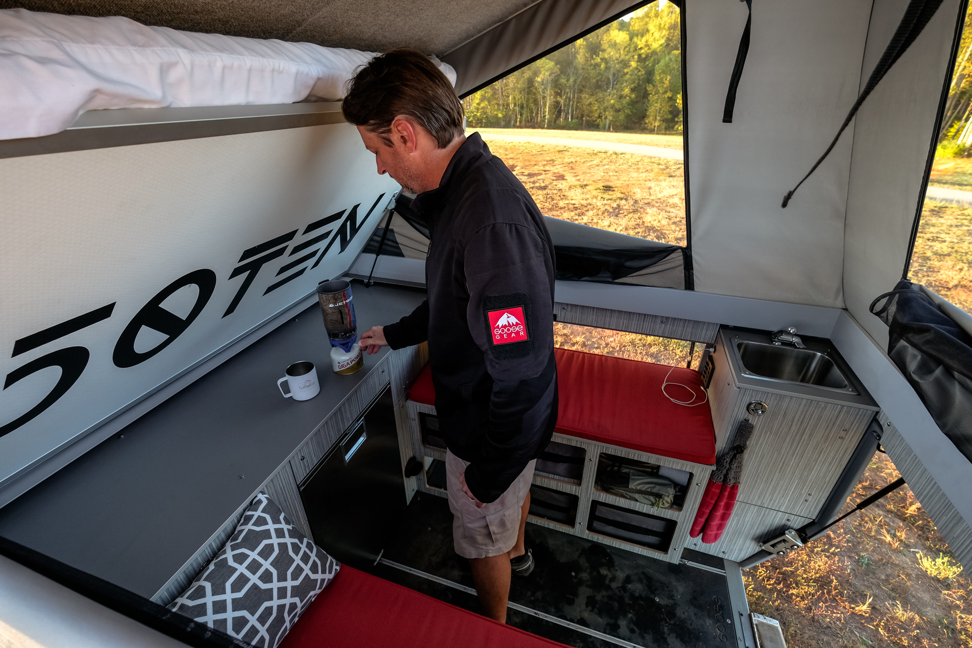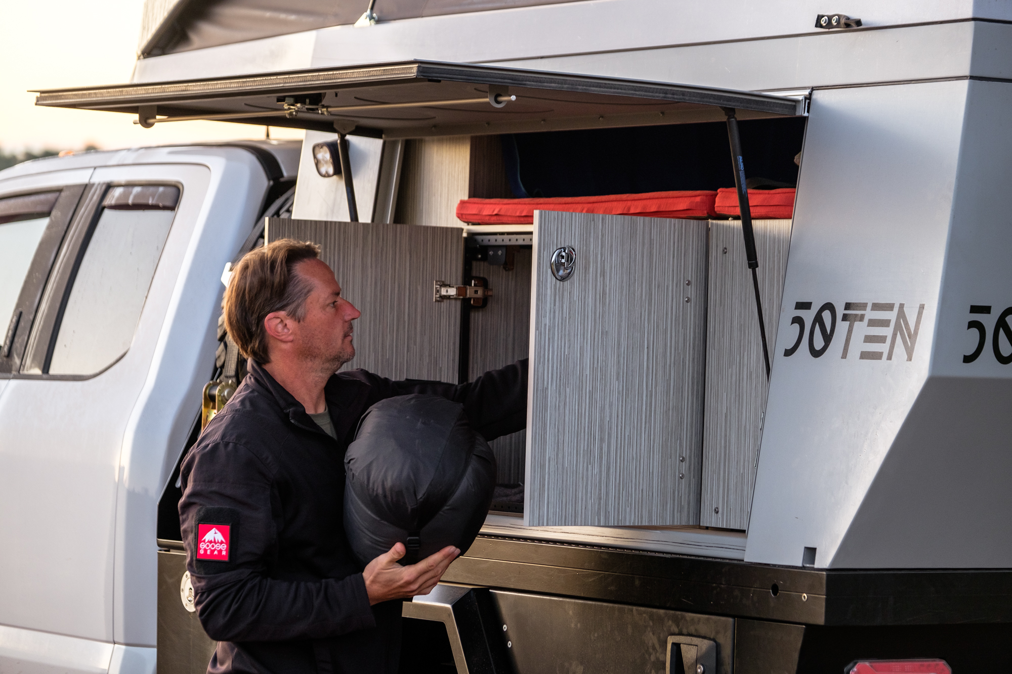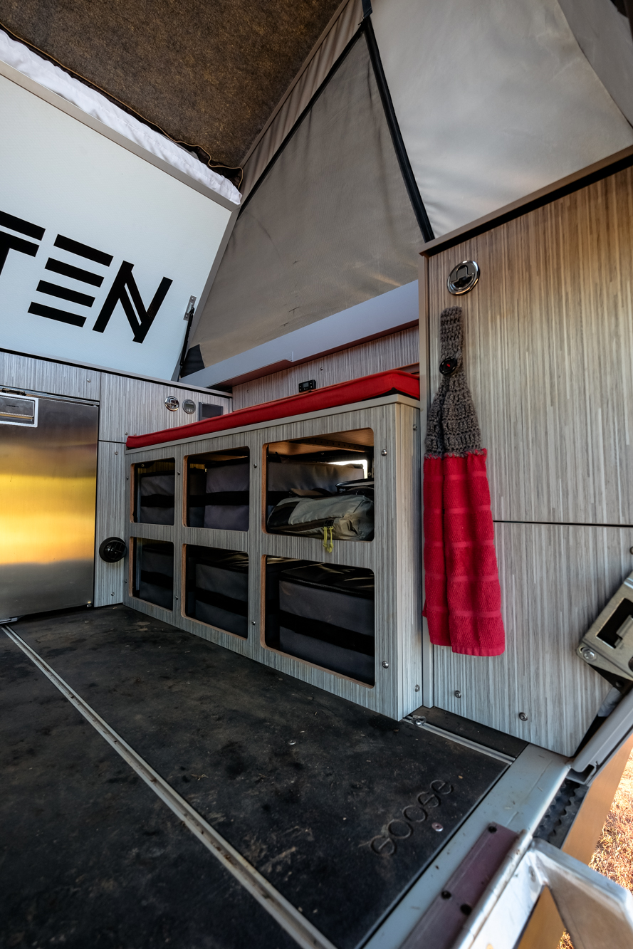 Of course, that’s before factoring in the interior. Much like a Four-Wheel Camper shell unit, the standard FiftyTen arrives as a blank slate with a bed, which is why Brian developed this magnificent layout from their S-Series product line. “The Interior systems we (Goose Gear) developed for the FiftyTen campers are part of our S-Series product line. We designed them to be stronger and lighter than the M-Series modules that we have been using in SUVs since the start of the company, and tailored them specifically for higher-end campers, expedition vehicles, and vans.”