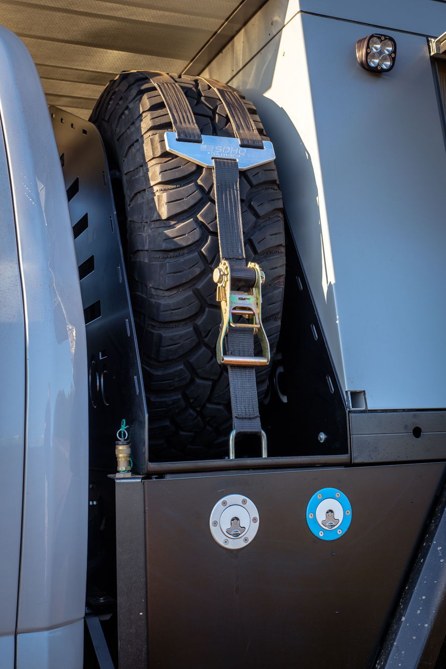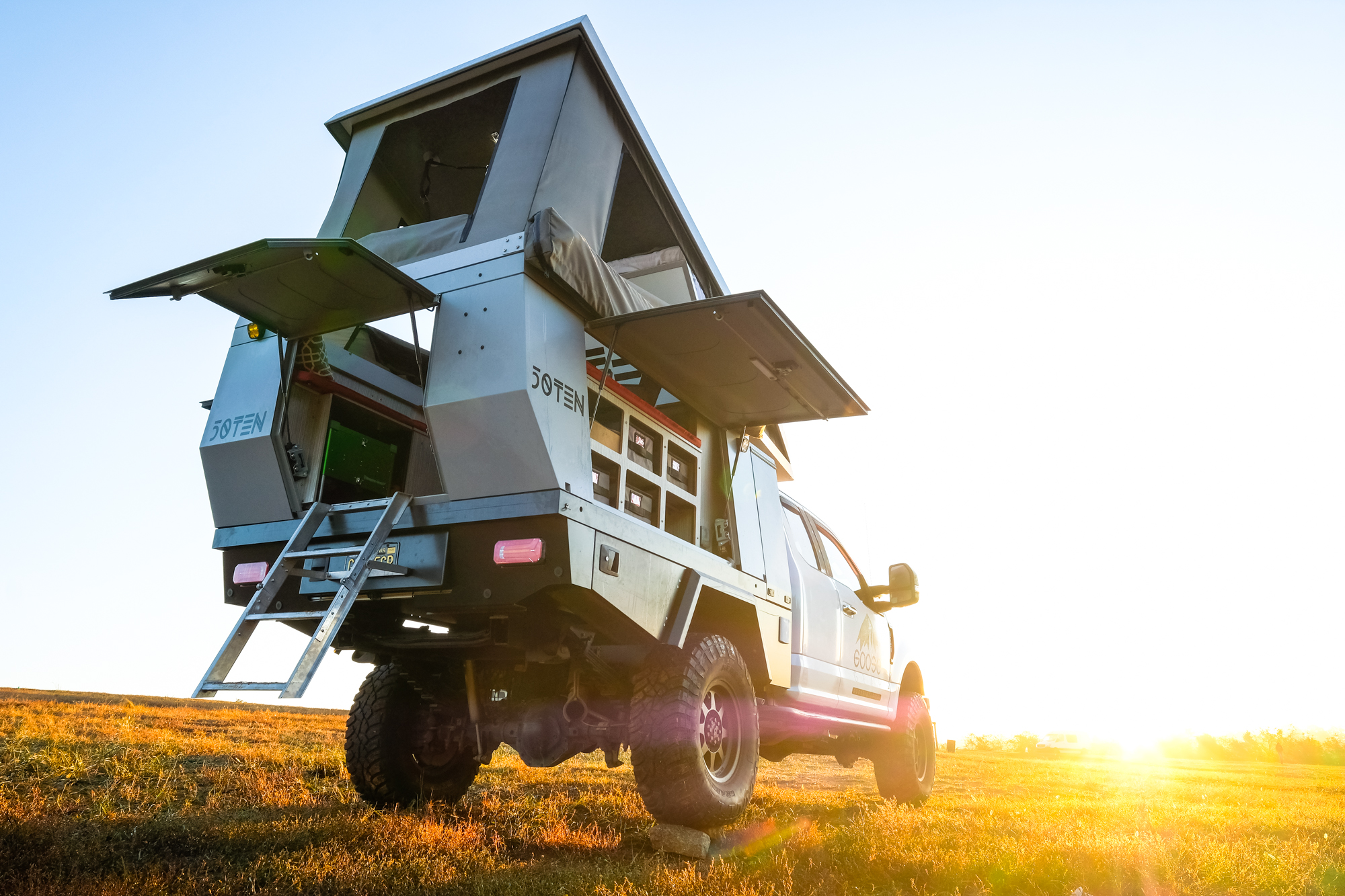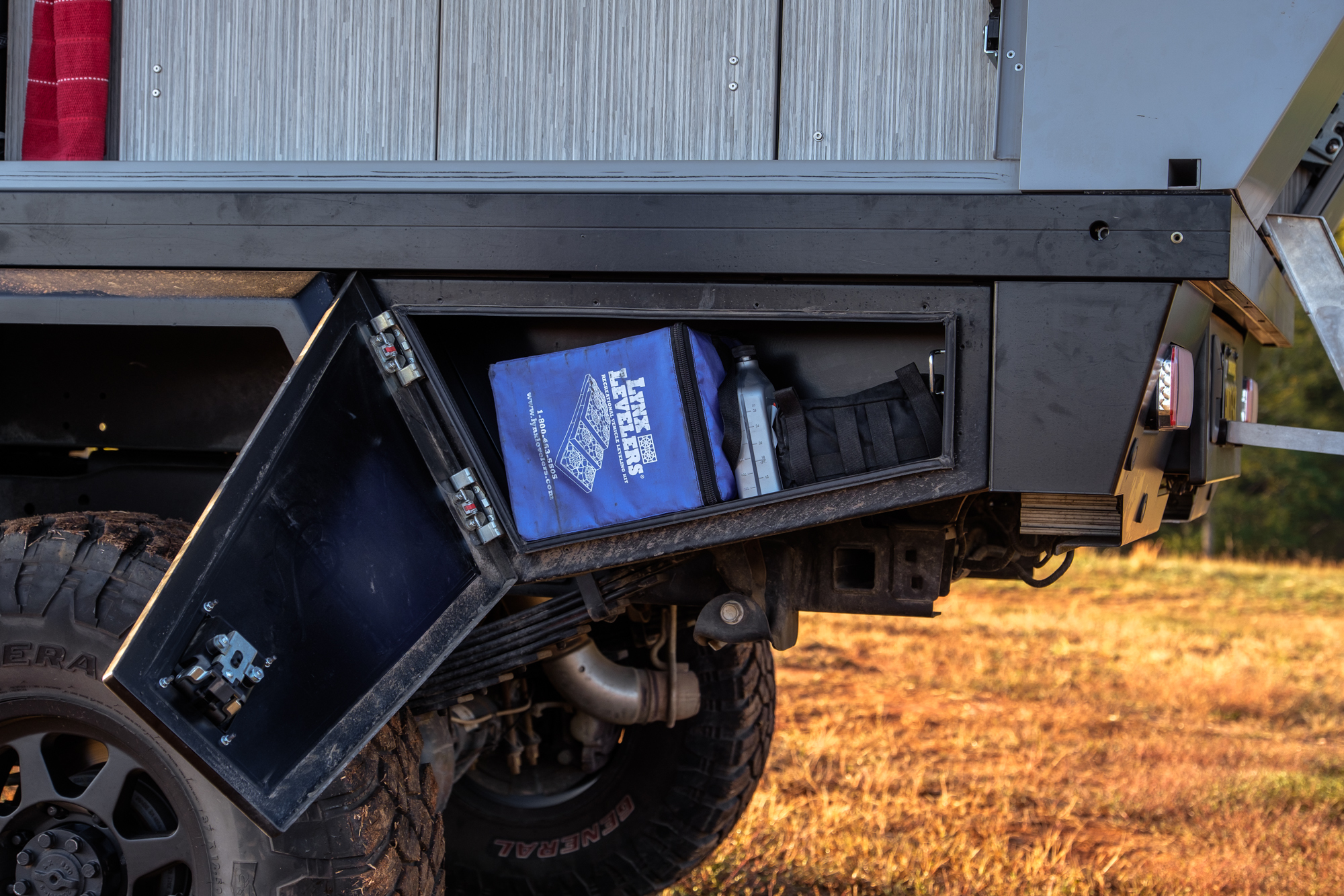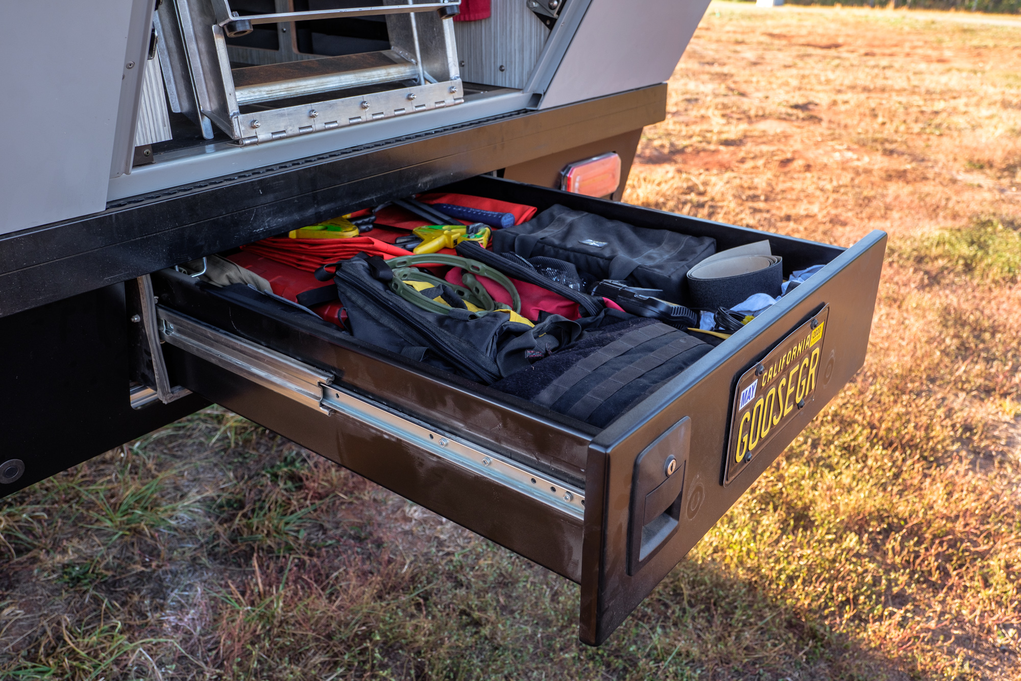 And finally, we arrive at this truck’s pride and joy, the FiftyTen camper. If you haven’t read about these units so far, you can get all of the details in our story on them here, but to sum it up, these fully aluminum modular camper systems are made in Germany and are comprised of a flatbed, canopy, and pop-top tent. The base tray features side storage boxes behind the wheels and a storage drawer in the rear for tools and fluids, and can be used as a flatbed for hauling cargo or as the base for the camper box which mounts to it. The camper itself is also built from aluminum and features two large gull-wing-style doors on the sides, a lift door for entry and exit in the rear, and an optional tire carrier specifically designed to accommodate sizes up to 40 inches for large trucks. Onboard air is available from two Extreme Outback Endura compressors and a 5-gallon reserve air tank with air chucks located on either side of the truck for easy access. All of this weighs in at approximately 1,200 pounds, but after removing the factory truck bed, Goose Gear only wound up with a net gain of around 900 pounds.