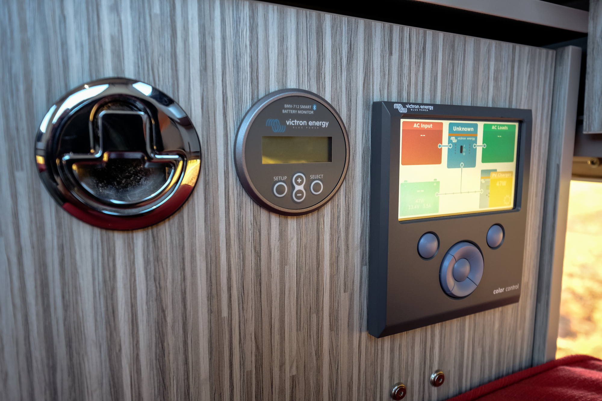 This layout was paired with an upright 110L Dometic CRX 110 fridge/freezer which is easier to access than traditional off-road fridges, and an integrated sink and faucet combo in the back. An Eberspacher diesel heater keeps the cabin warm in all weather conditions, and a passive-radiator-style heater by Elgen keeps your water hot at the tap. Almost all of the electrical systems are made by Victron Energy and run off of a 160ah smart lithium battery which charges from Twin Renogy 100-watt solar panels and the Ford’s factory dual alternators that produce 440 amps. Battery control is covered by the Victron BMS 12/200 battery management system, with monitoring by a BMV 712. Twin solar panels are mounted to the roof and controlled by another Victron component, the Smart Solar MPPT 100/50, which allows Goose Gear to wire the panels in series.