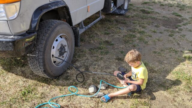 We run “Super Single” GABO 19.5-inch steel rims (which are pretty much the biggest you can fit without making modifications—some people run 20-inch Unimog rims, but this requires work) on Pirelli TR:01 285/70R19.5 tires, and we chose not to opt for all-terrain tires for a couple of reasons. We spend most of our time on the road, and the AT tires are noisy and eat through fuel faster. In terms of the 19.5-tire category, there aren’t too many options, so we went for the Pirelli tire, which is made for mountain busses. Hence, some off-road capability, but mainly for climbing up and down the Italian alps (they’re also four-season and snow-rated). When we were skiing in Bulgaria this winter, it was just the snowploughs and the Vario that were getting to the top of the mountain, and that was without our snow socks (we use snow socks rather than chains due to the weight and size, but we’ve never needed them).
